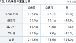 通常のスーツに比べ、約100gの軽量化に成功したオンリーの超軽量『空仕立て』です。