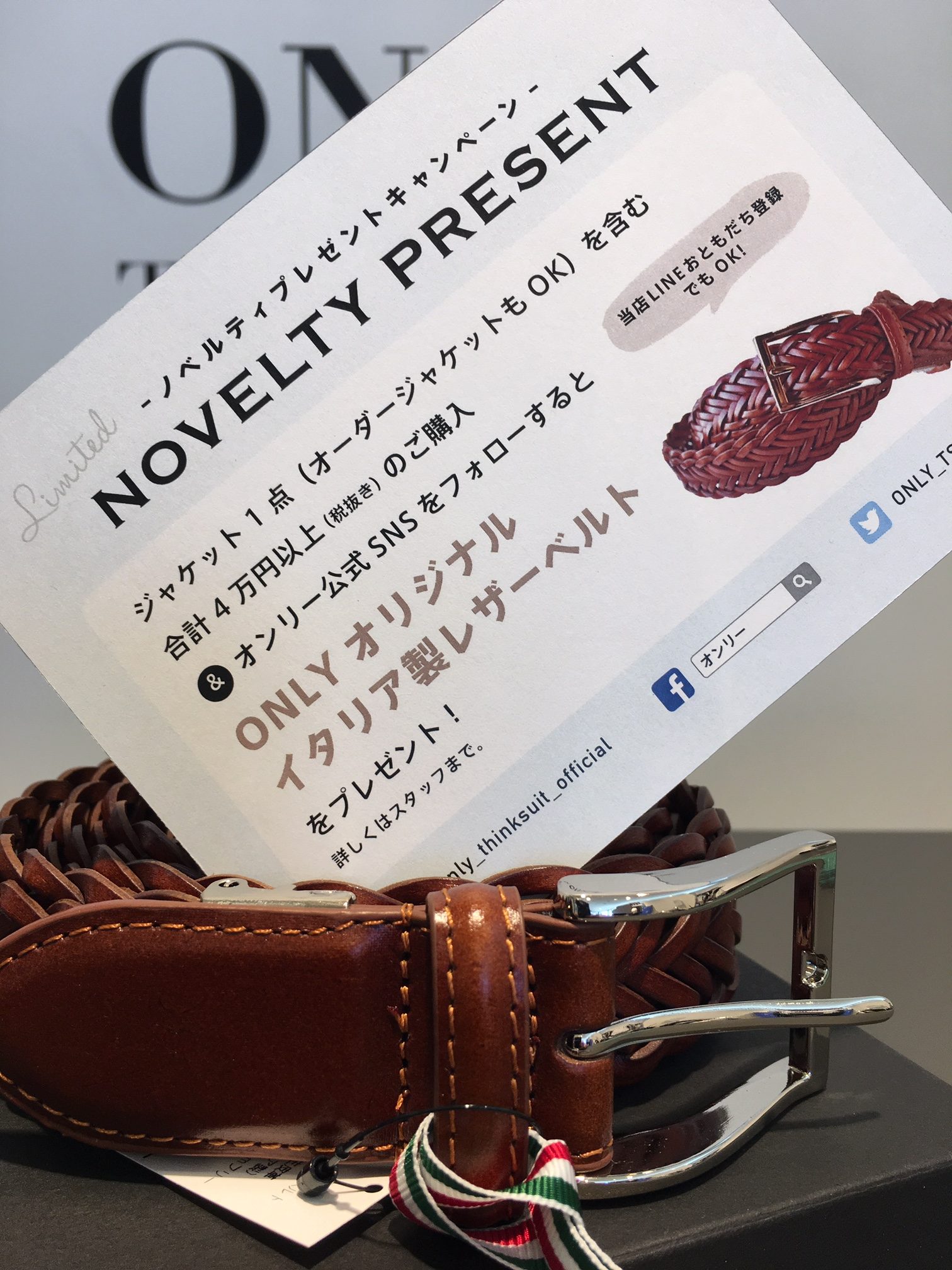 ただいまジャケットを含む合計4万円以上のお買い上げでイタリア製ベルトプレゼントのキャンペーンを実施中です。