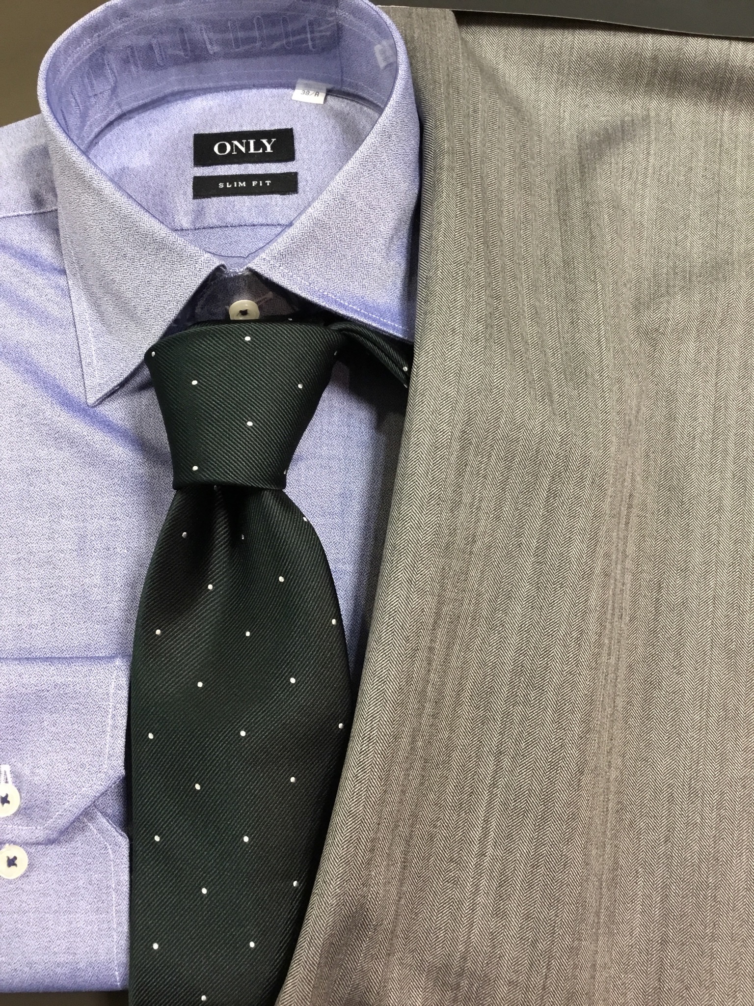 色の相性のよいブルーシャツとグリーンのネクタイを合わせれば、穏やかで清潔感のあるコーディネートに仕上がります。