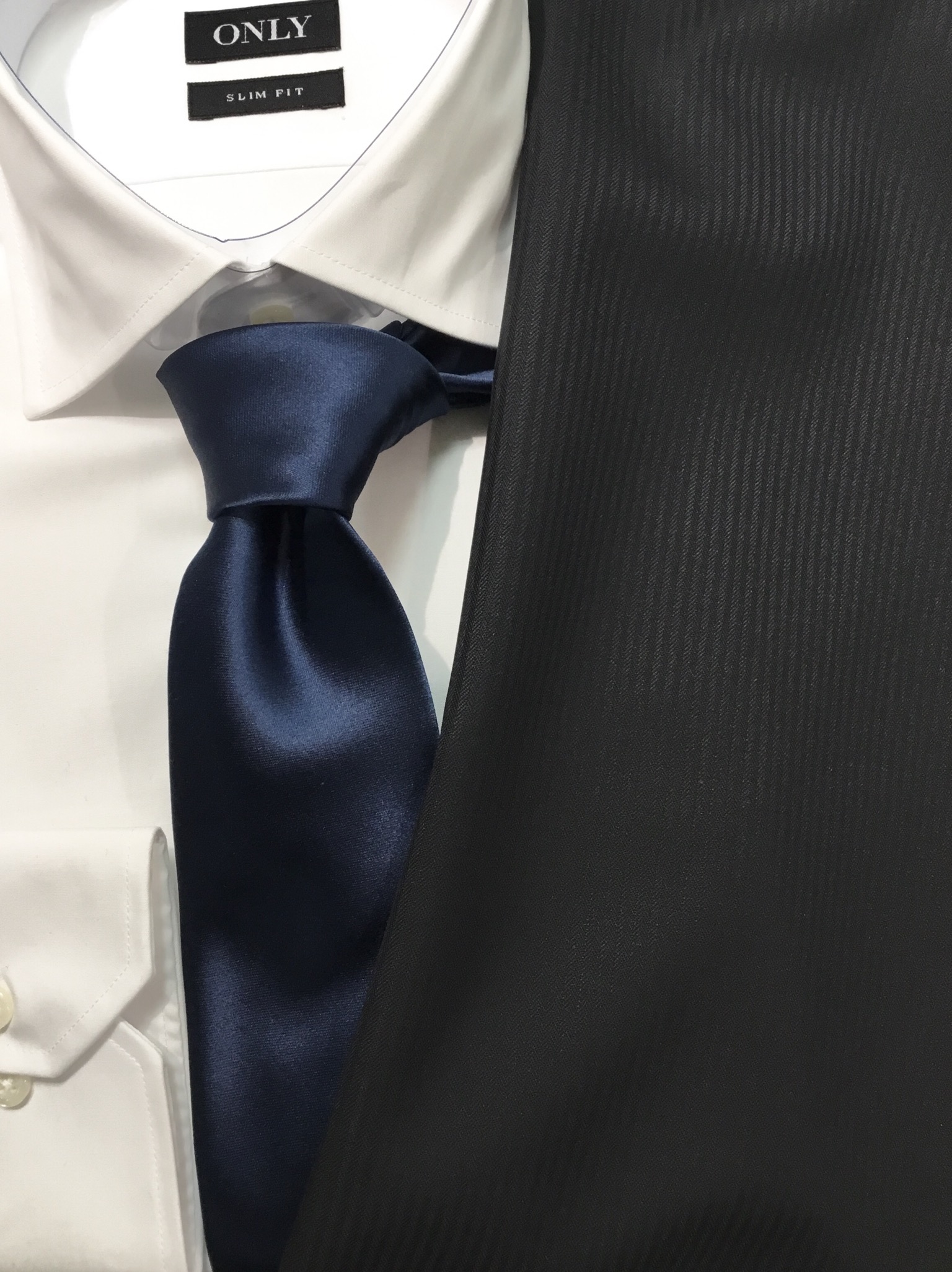 黒を引き立てさせる白シャツにシルクサテンのソリッドタイを合わせれば、モダンでスタイリッシュな着こなしができます。