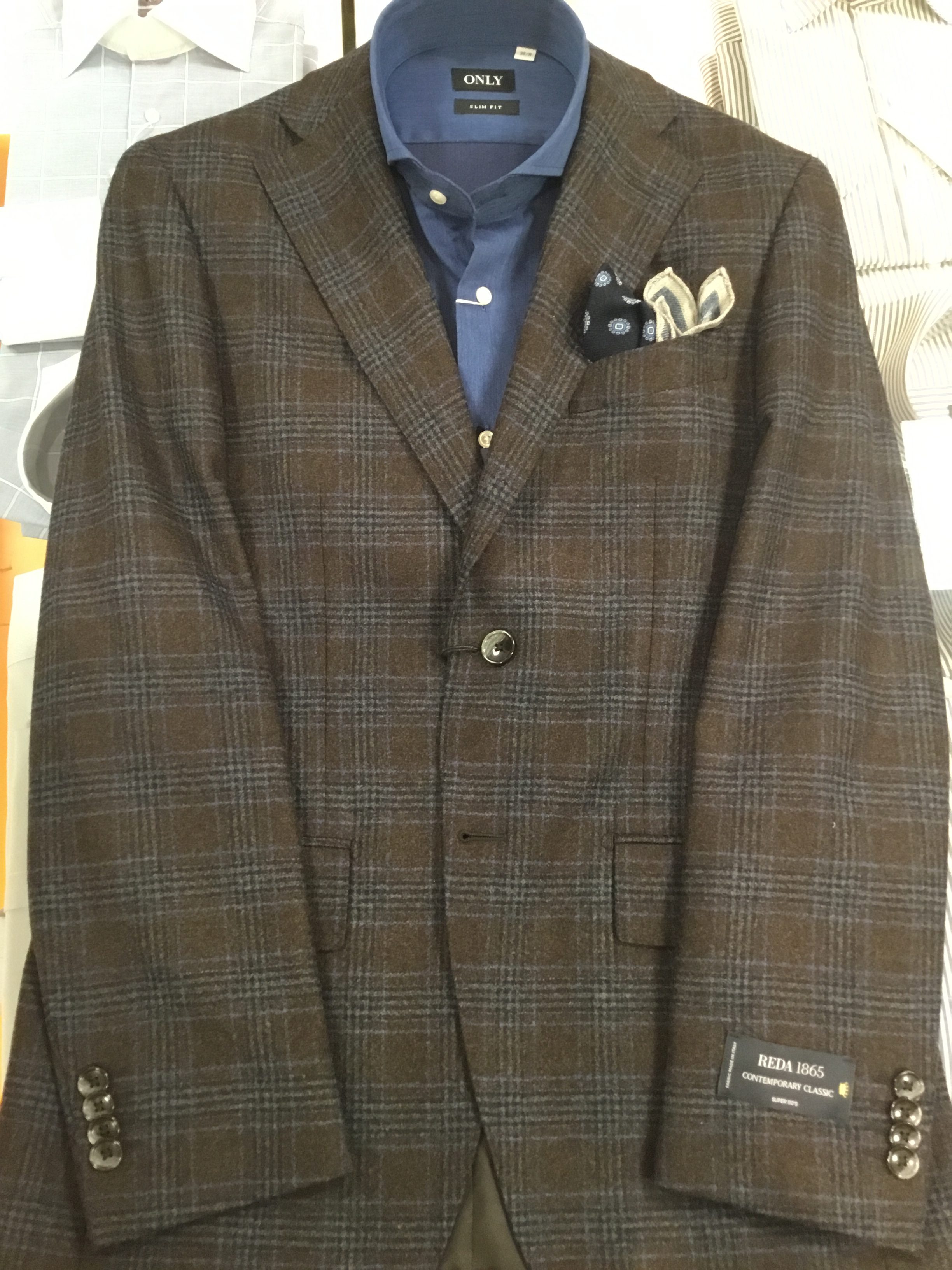 REDA社のSUPER 110’sのソフトツイード素材のジャケット。ブルーのオーバーペーンが入った少しこなれた感じとトレンド性のある一着です。柔らかさと暖かさが特徴であり、素材の良さを活かし軽く羽織るのも魅力的です♪