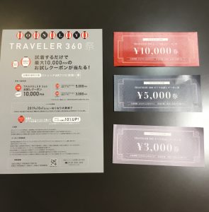 トラベラー360を「ご試着頂き伸び感を体感し」、「ストレッチARクジ」に挑戦して頂くだけで最大10,000円分のクーポン券を差し上げるというキャンペーンになります。