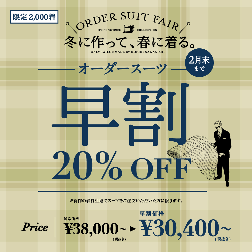 ONLYの『早割』とはオーダースーツ(テーラーメイド)が生地代より20%OFFでお求めいただける機会です。