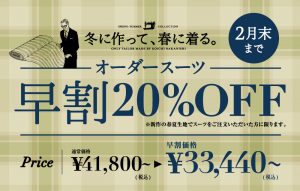 2ヶ月待てば、新作生地のオーダースーツが20%OFFで作れる!!