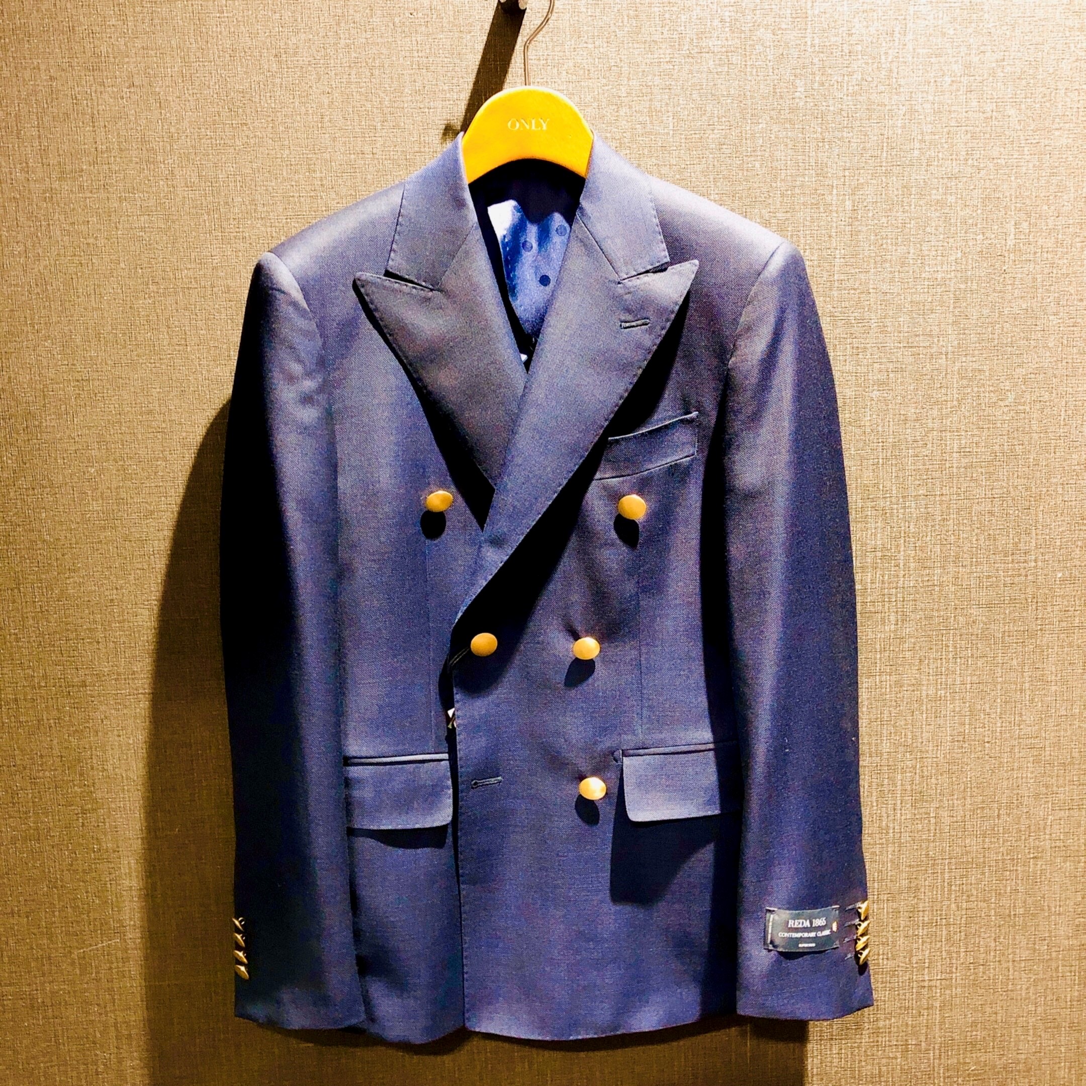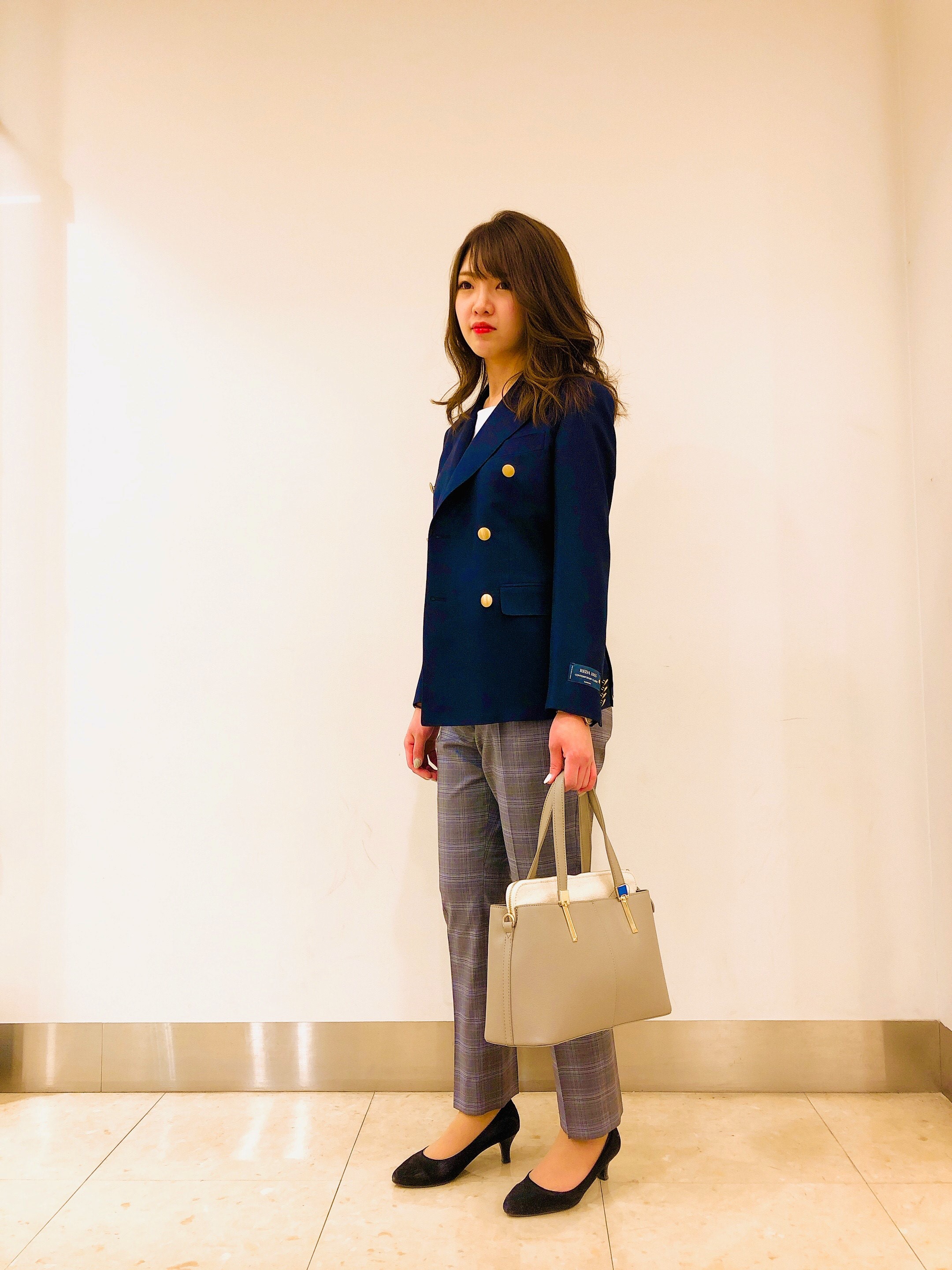 1着目は、メタルボタンが印象的なネイビーブレザータイプのダブルジャケット
