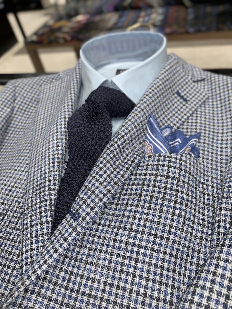 こちらのジャケットにはグリーンのカラーシャツにネイビーのニットタイを合わせました。