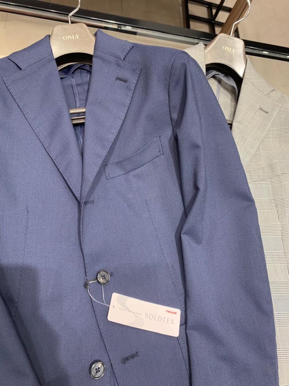 TEIJINのソロテックスは繊維が らせん状のバネのようなしなやかな動きをとることができ「ソフト」で「軽やかに伸び」いつも「しっかり戻ろう」します。そのためジャケットやパンツの締め付け感が少なく、防シワも♪