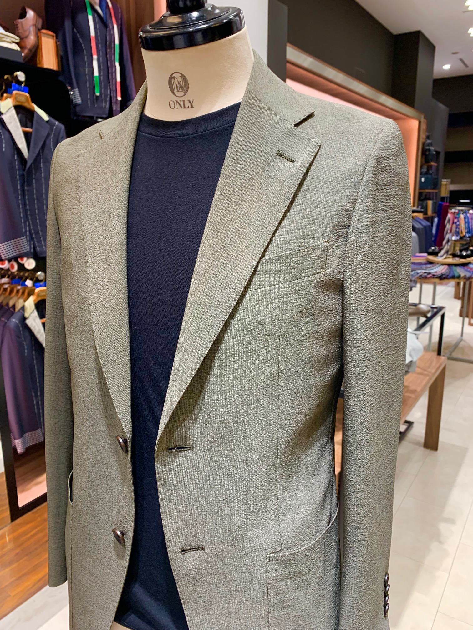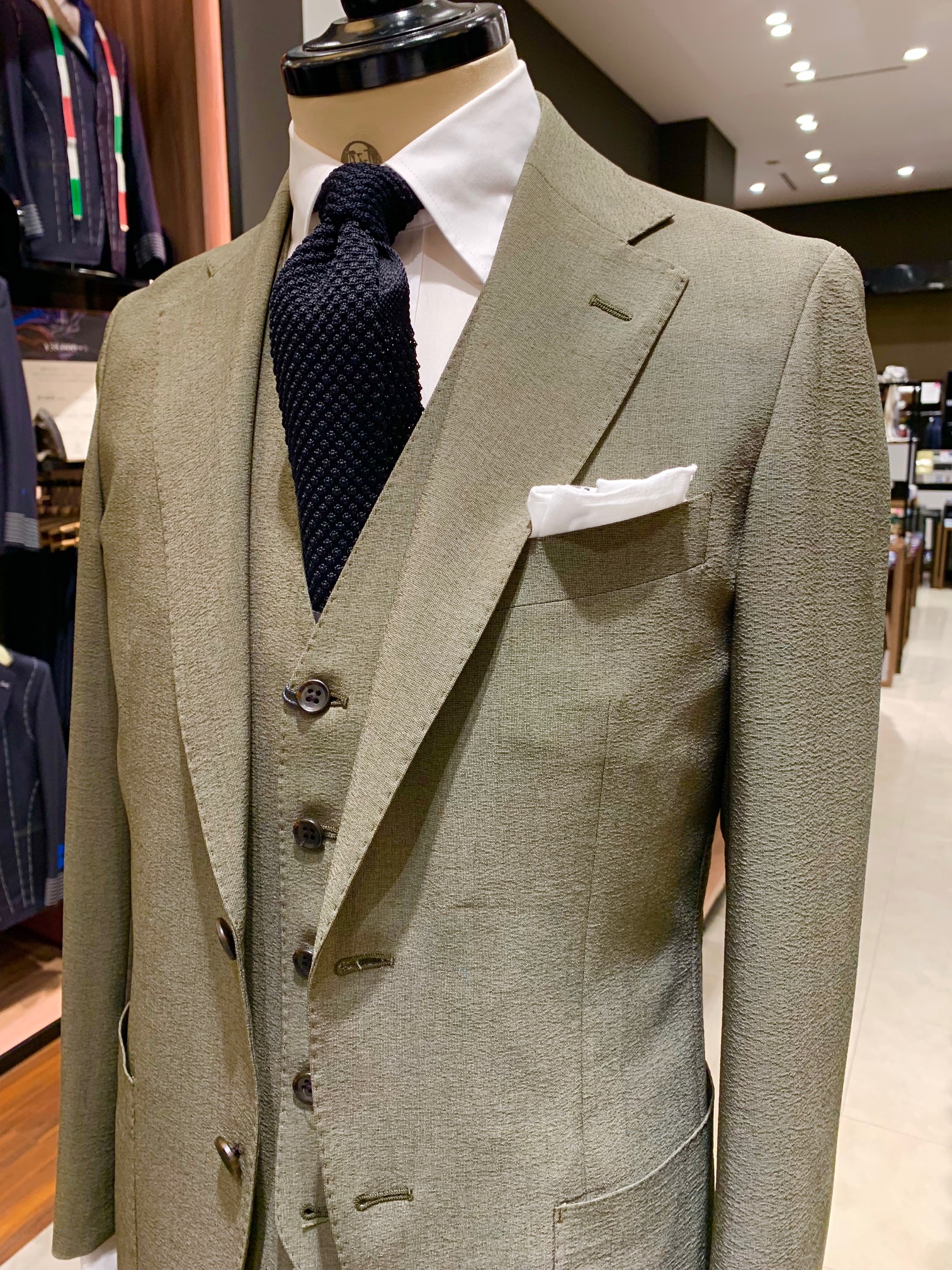 カーキとドライタッチな生地感がタイドアップスタイルも軽やかな印象に。