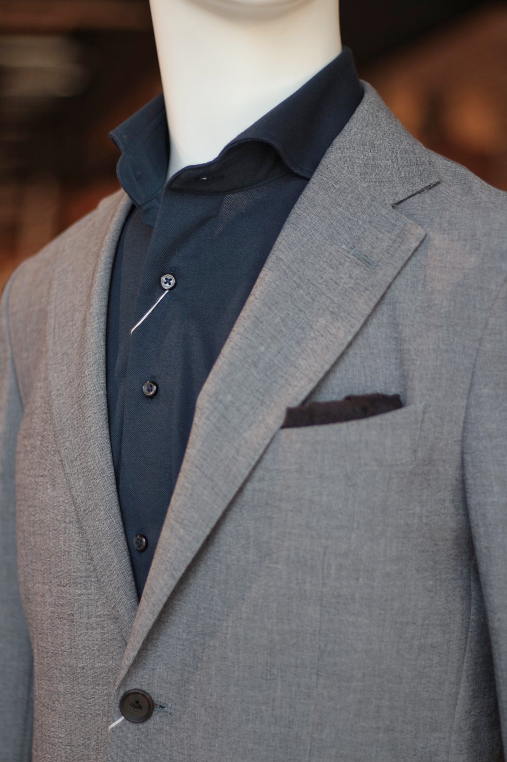 衿付きシャツを合わせてカッチリ感を出します。インナーもジャージー素材のシャツを合わせているので着心地の良さも◎