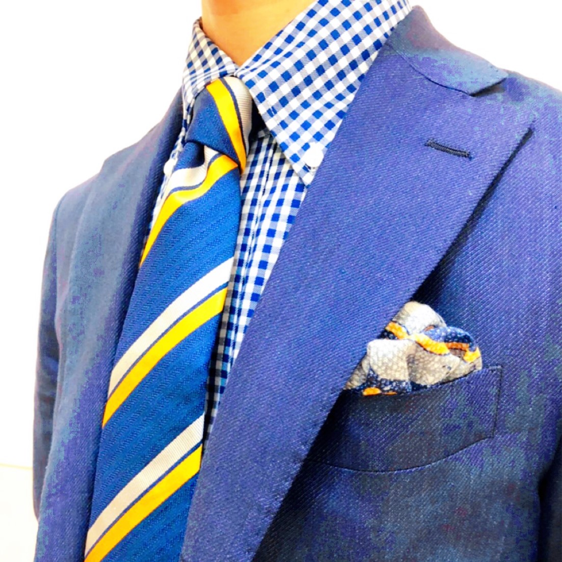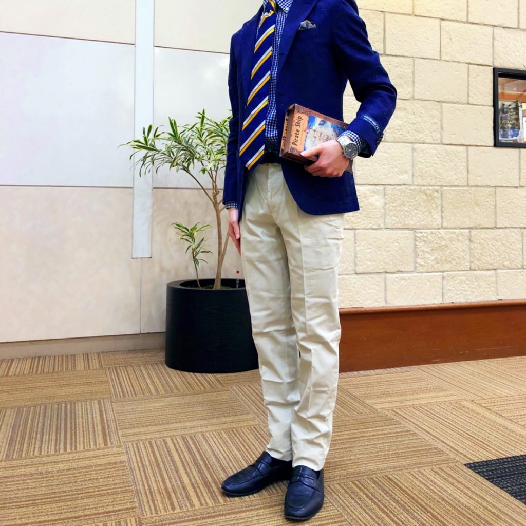 ボタンダウンシャツとトレンドカラーのイエローが入ったタイを合わせたトラッドスタイル