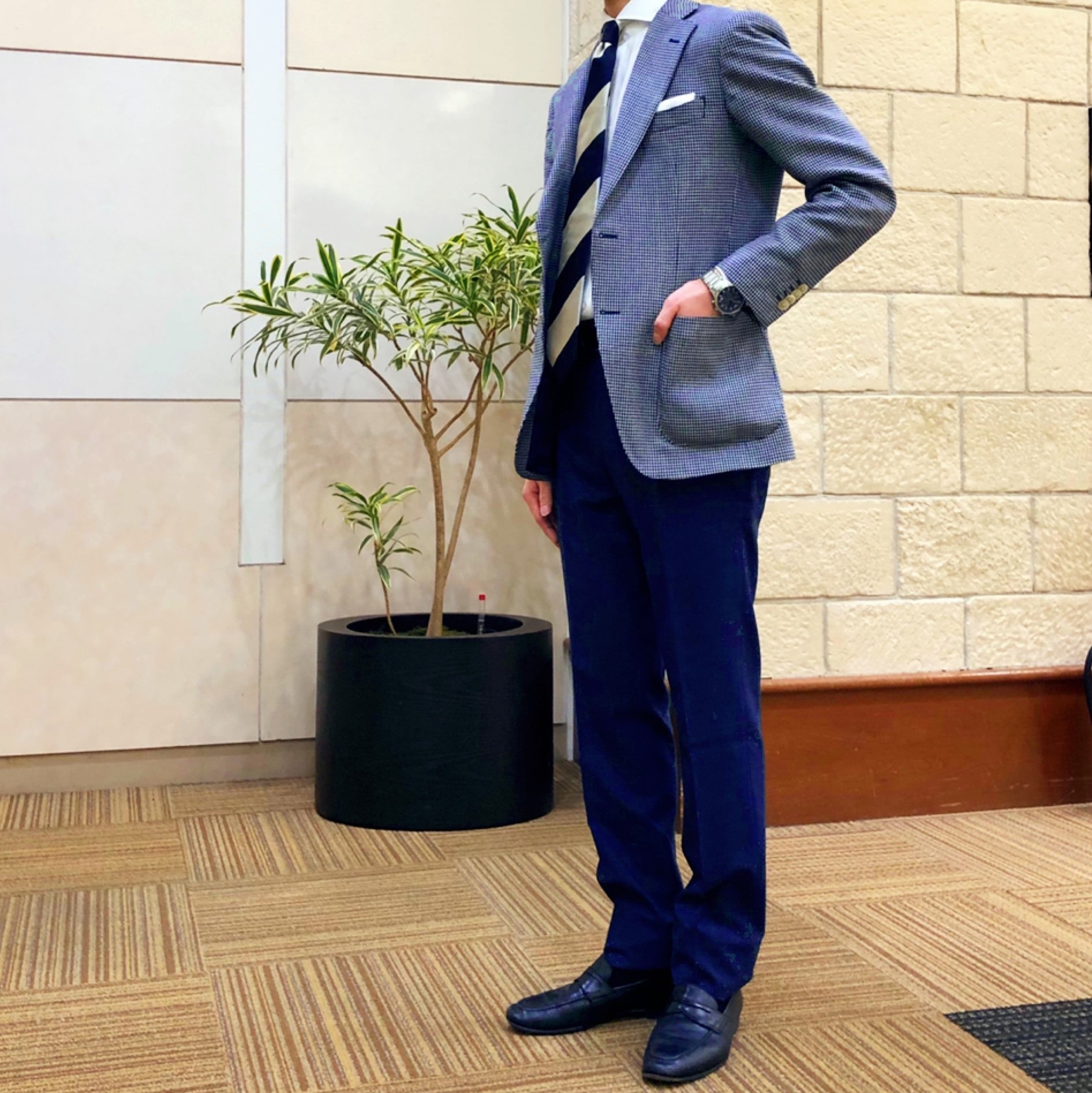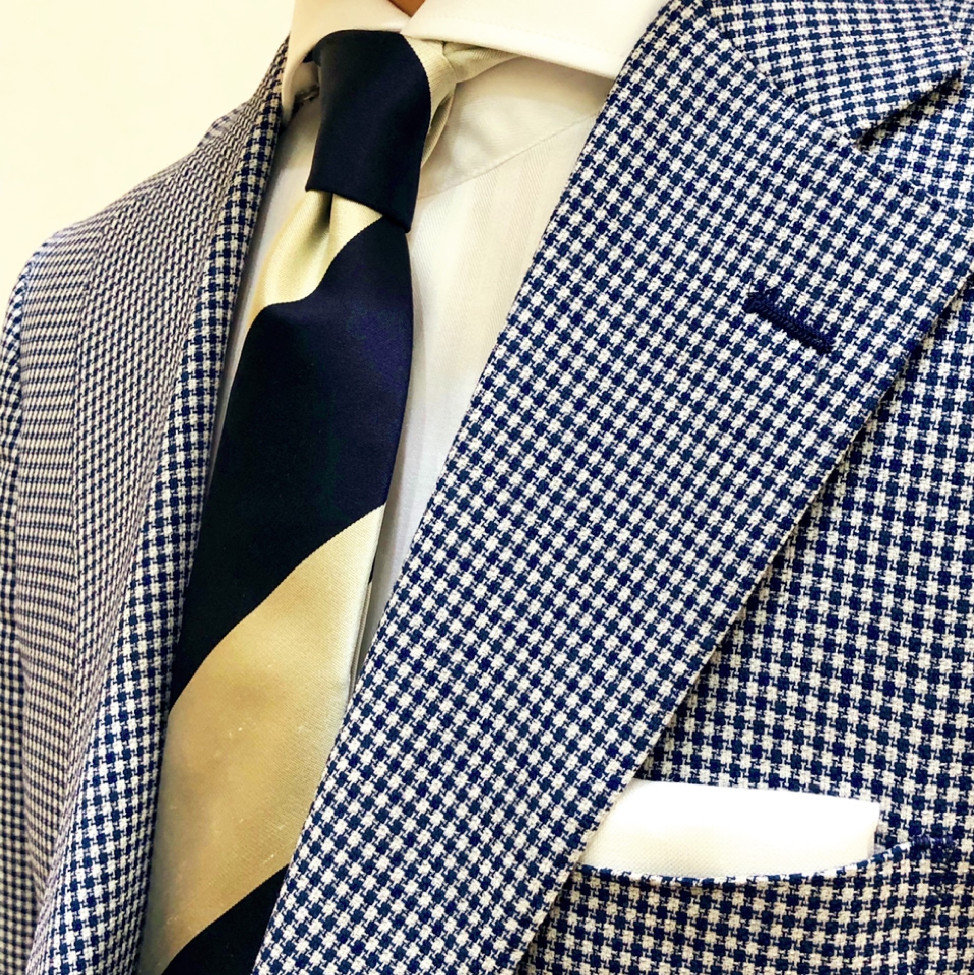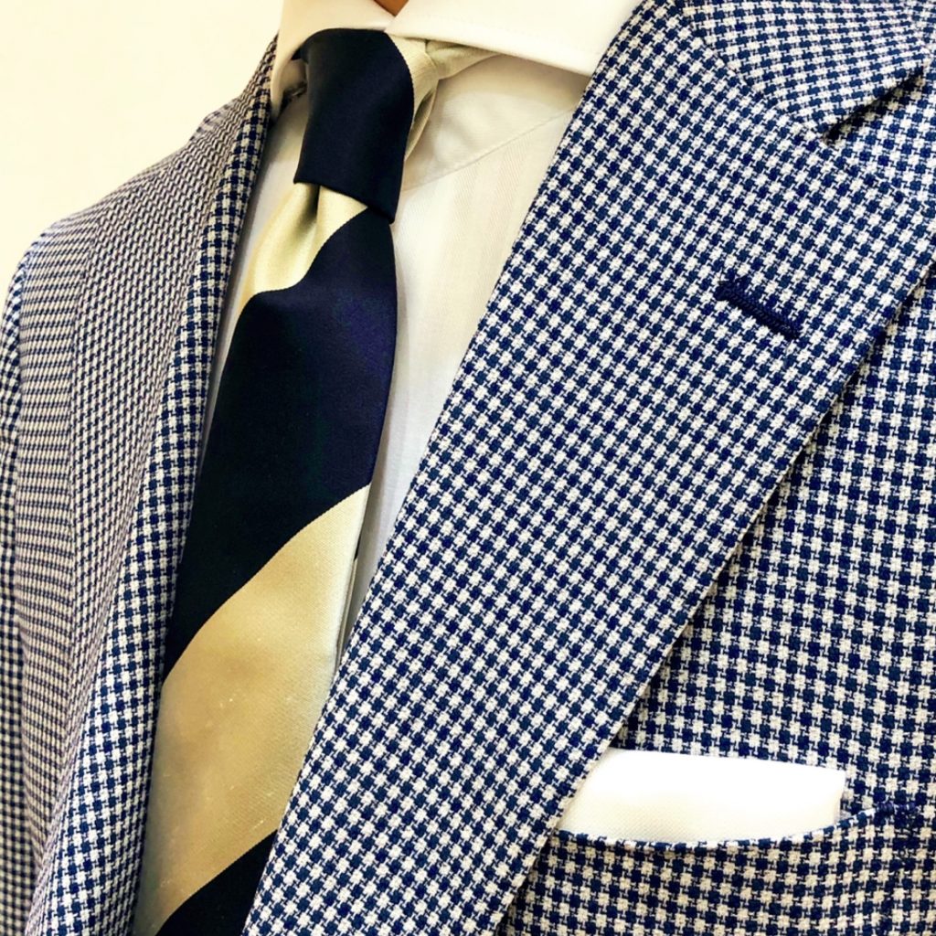 トラッドな千鳥格子ジャケットシックな白黒基調の大柄タイを合わせた