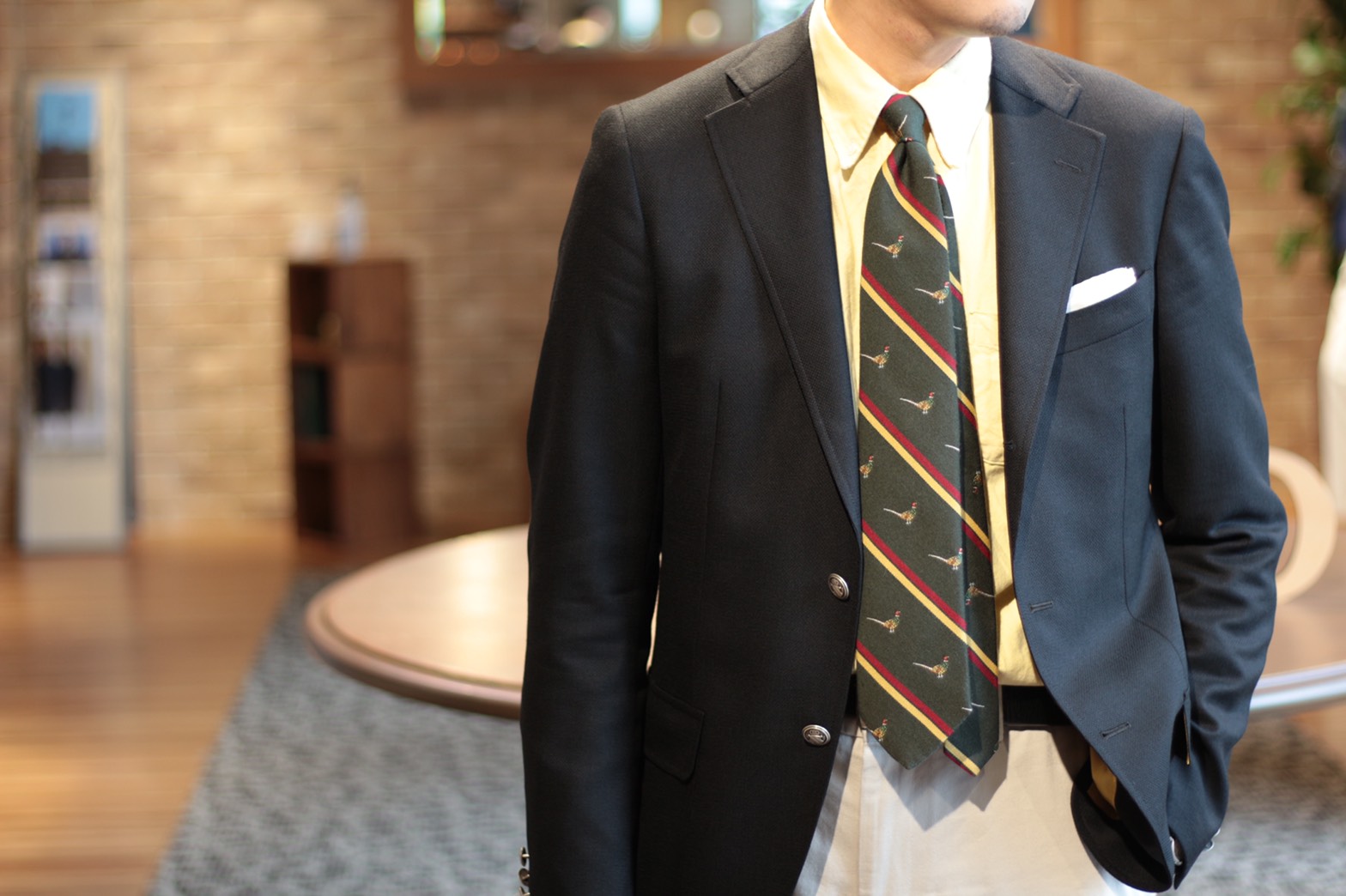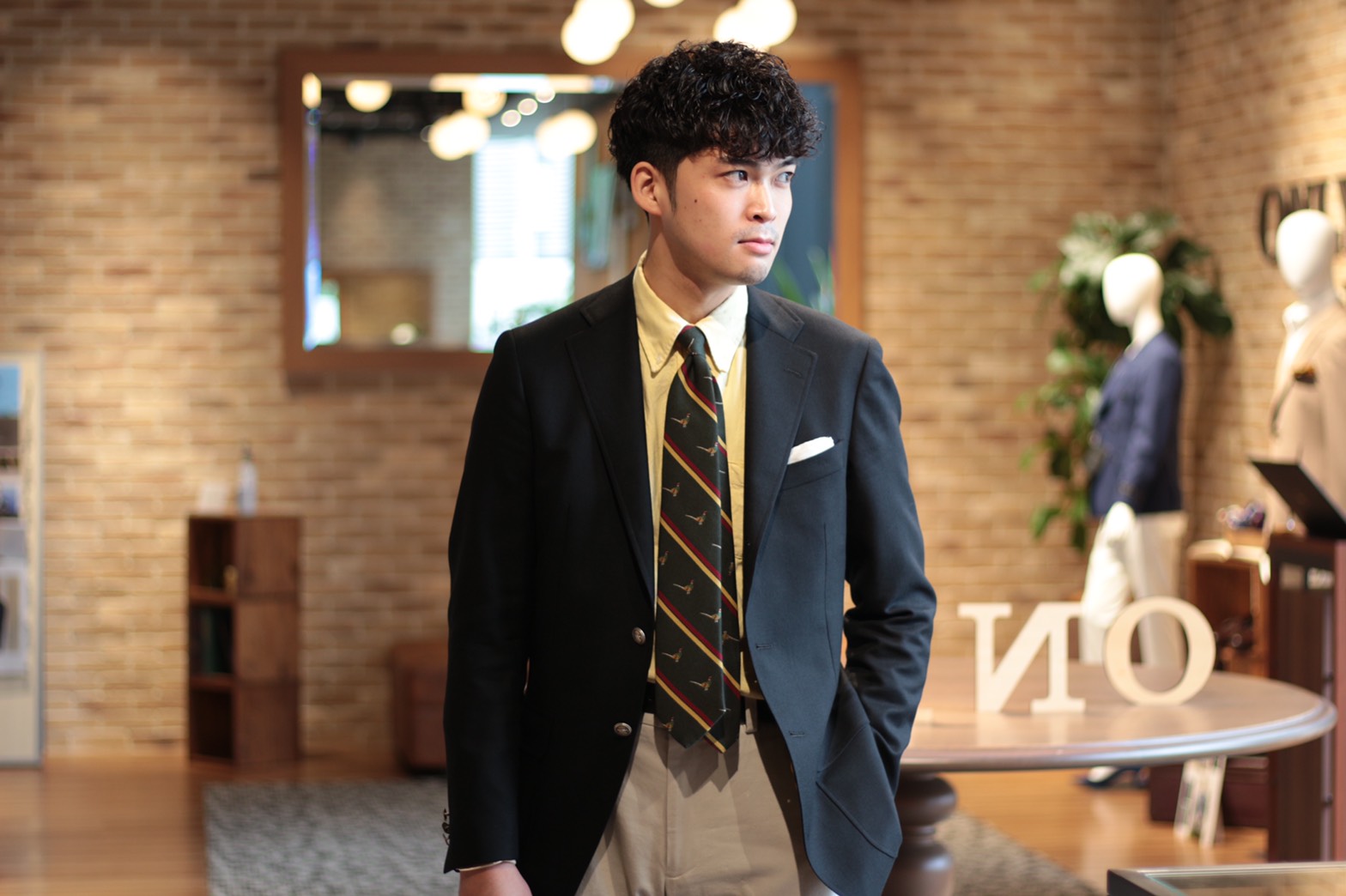 イエローのシャツを挿し色に、レジメンタル・タイをしめて今人気の「スクールスタイル」が完成☆