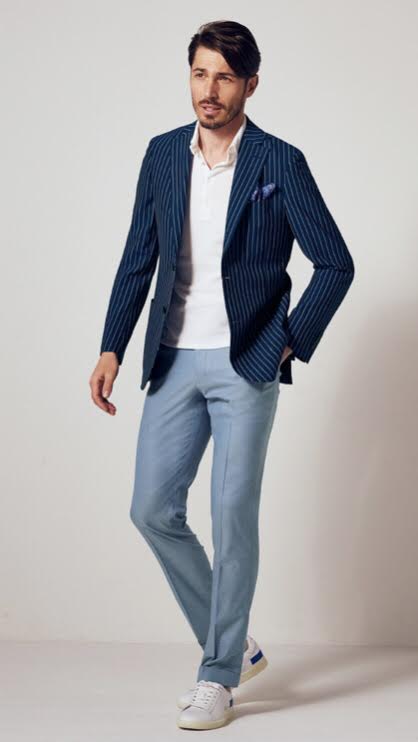 着こなしが難しく思われがちなストライプジャケットですが、他のアイテムを無地で統一することがポイント。