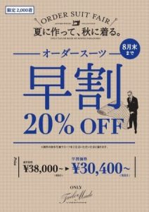 オーダースーツをお納めするまでの納期を最長2か月頂戴するかわりに、生地価格から20%お値引きさせていただく大変お得なキャンペーンとなっております。