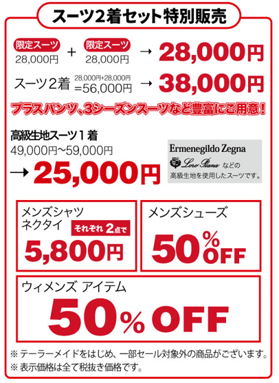 ※380,00円スーツ(スリーピーススーツ、ツーパンツスーツ、プラスパンツスーツ、インポートスーツ)は2着で48,000円になります。