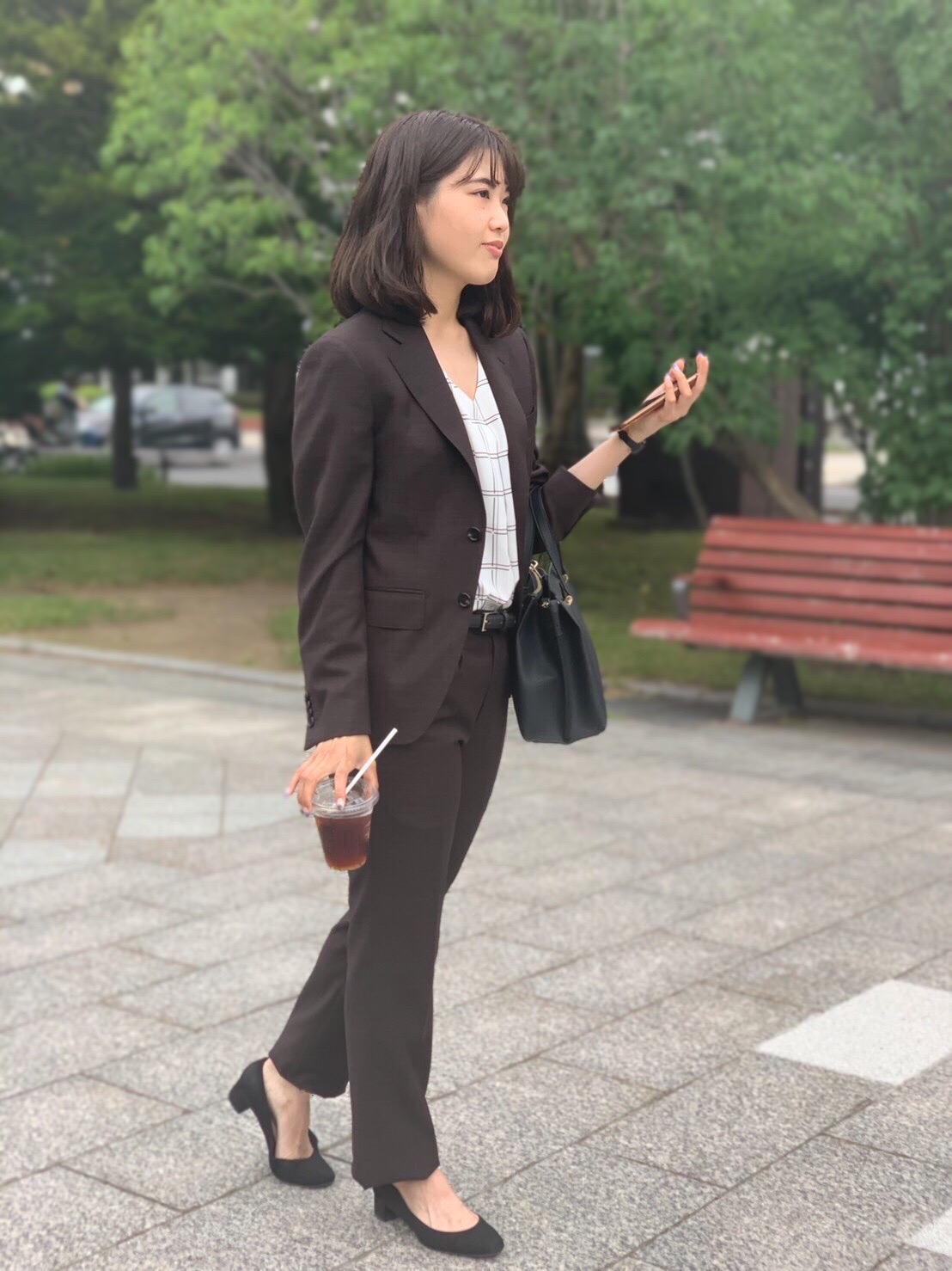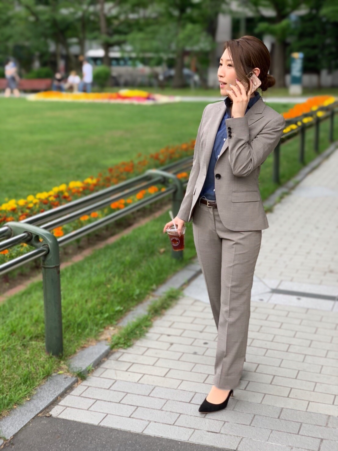 ベージュの上品な柔らかいセットアップにネイビーのシャツを合わせる事により、