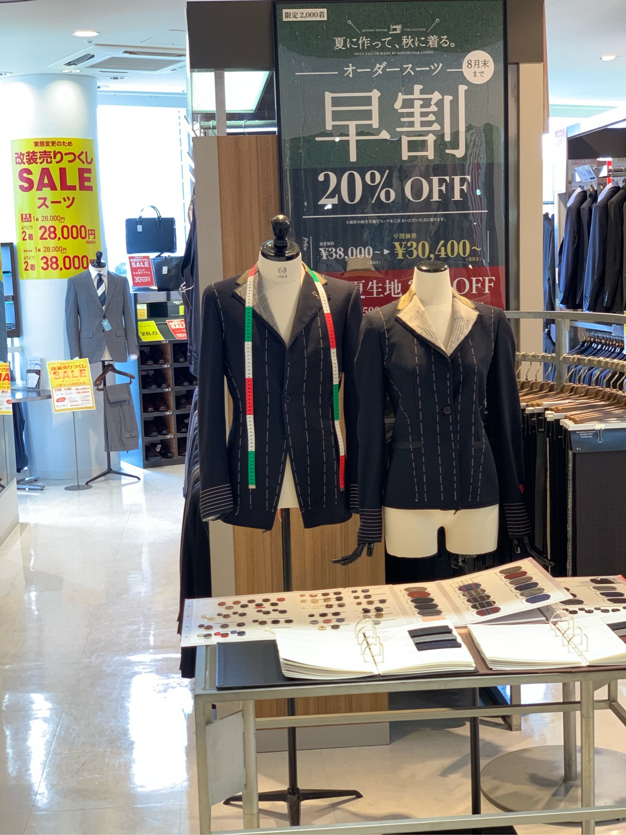 オーダースーツをお納めするまでの納期を最長2か月頂戴するかわりに、生地価格から20%お値引きさせていただく大変お得なキャンペーンとなっております。