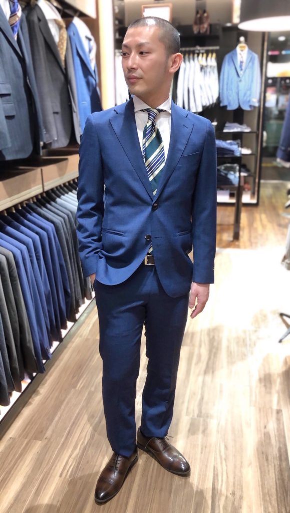 ブルーのスーツは爽やかさもあり、着回しに取り入れたいスーツです!