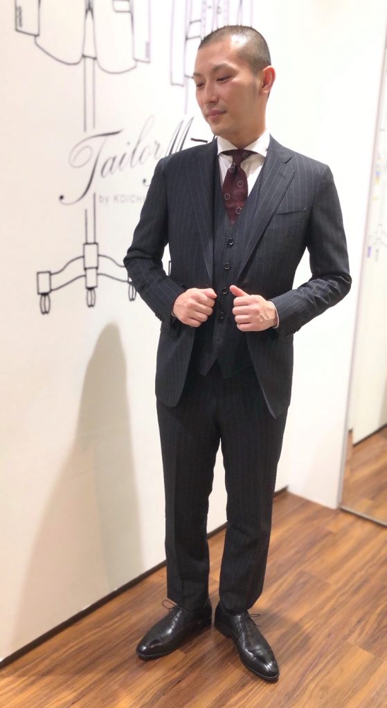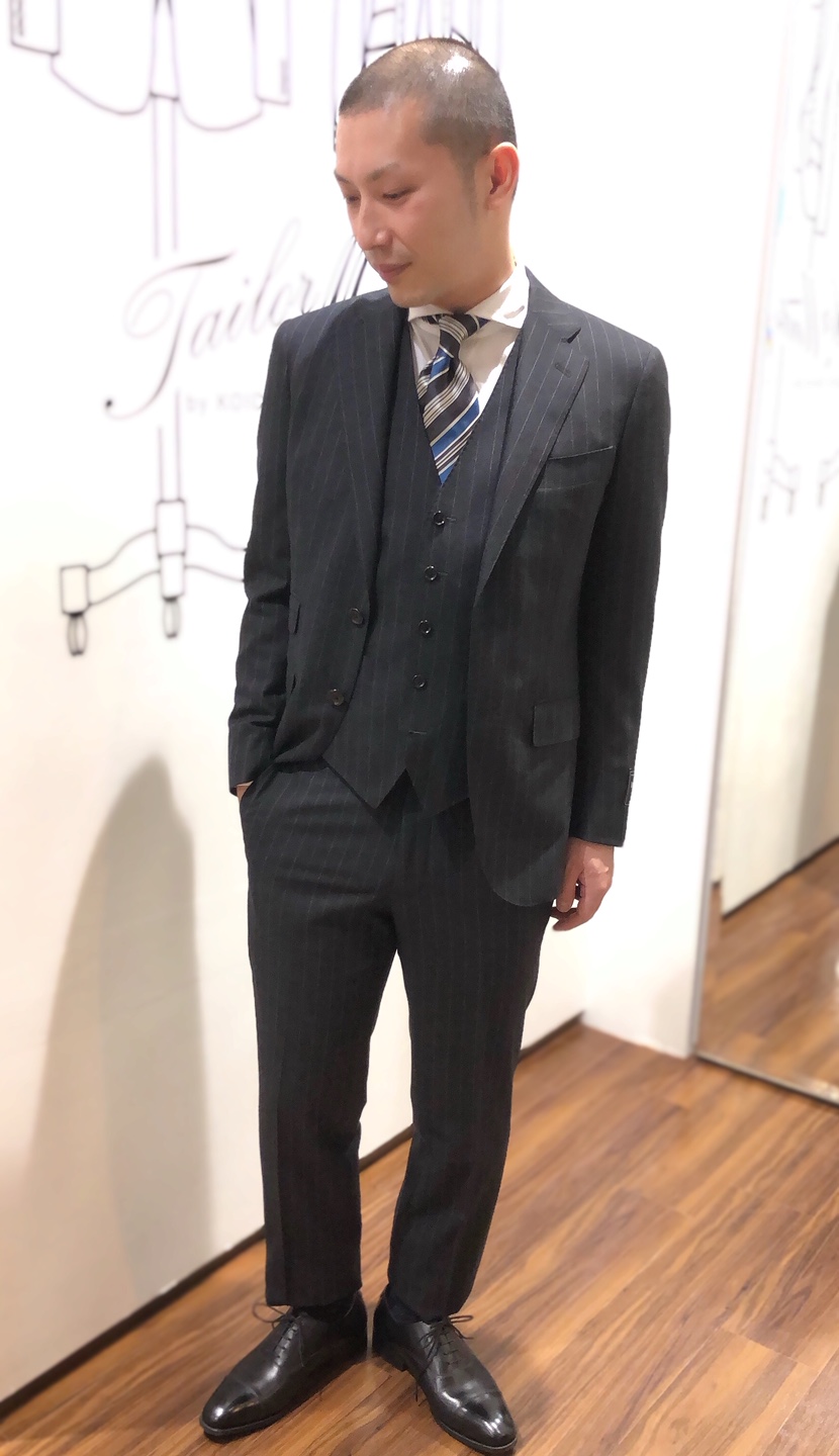 2着目はストライプが映えるチャコールグレーのスーツをご紹介いたします。
