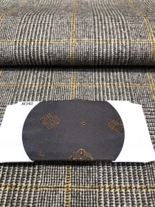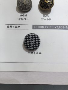 ボタンは生地くるみで、実際にはスーツ生地と同じボタンがつくので