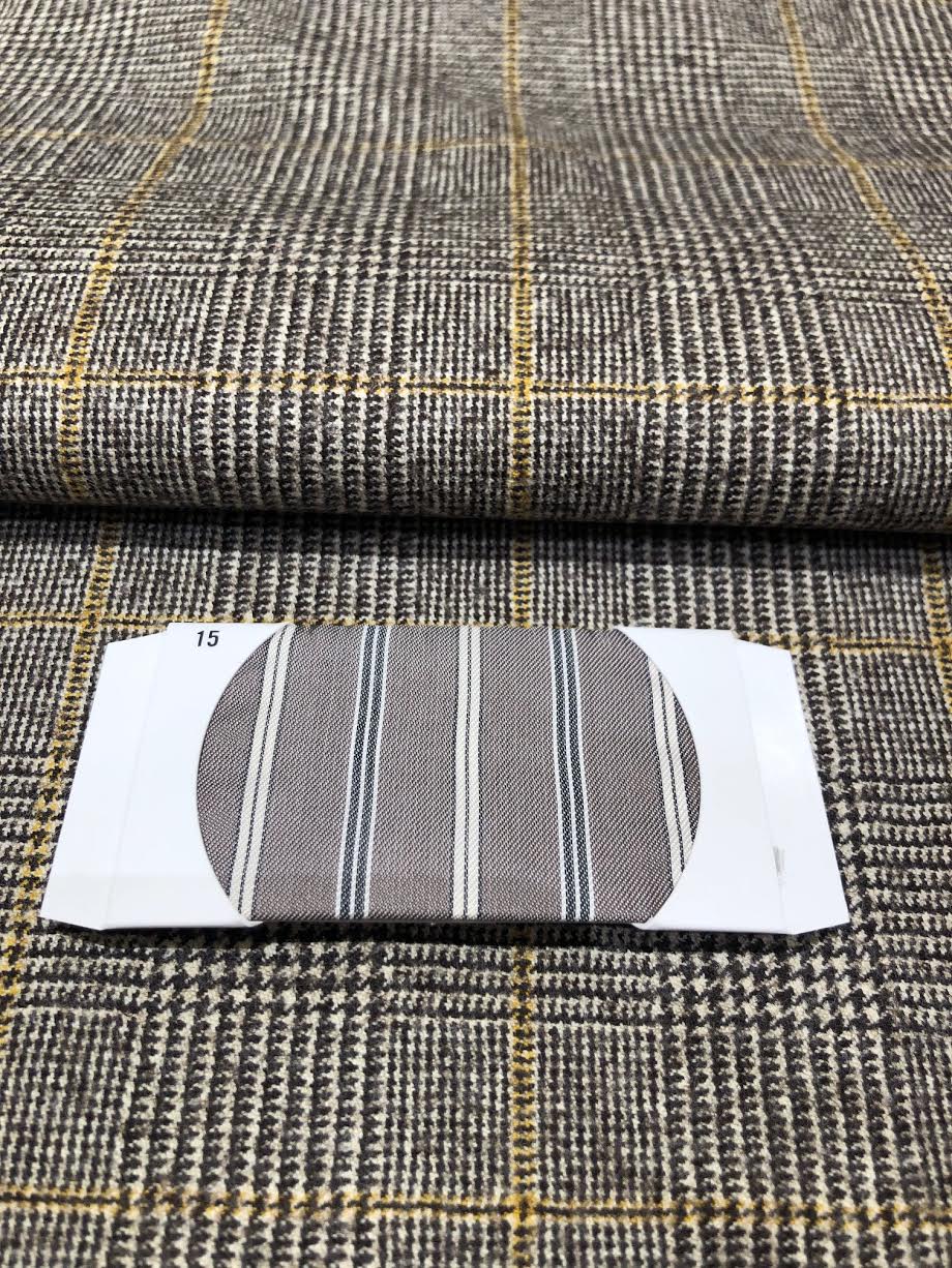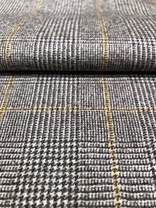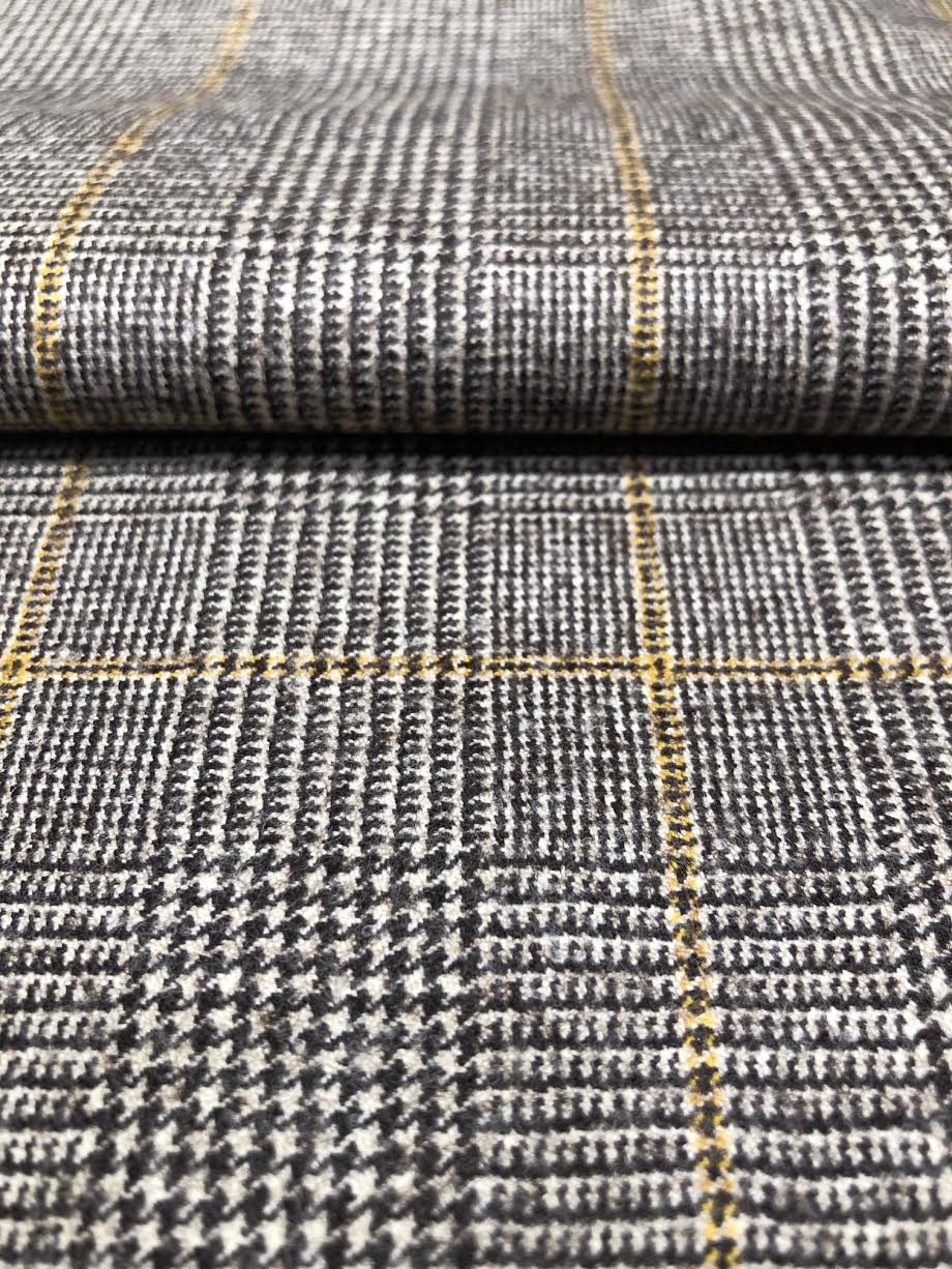 ブラウンのグレンチェックにトレンドカラーであるイエローのオーバーぺーンが