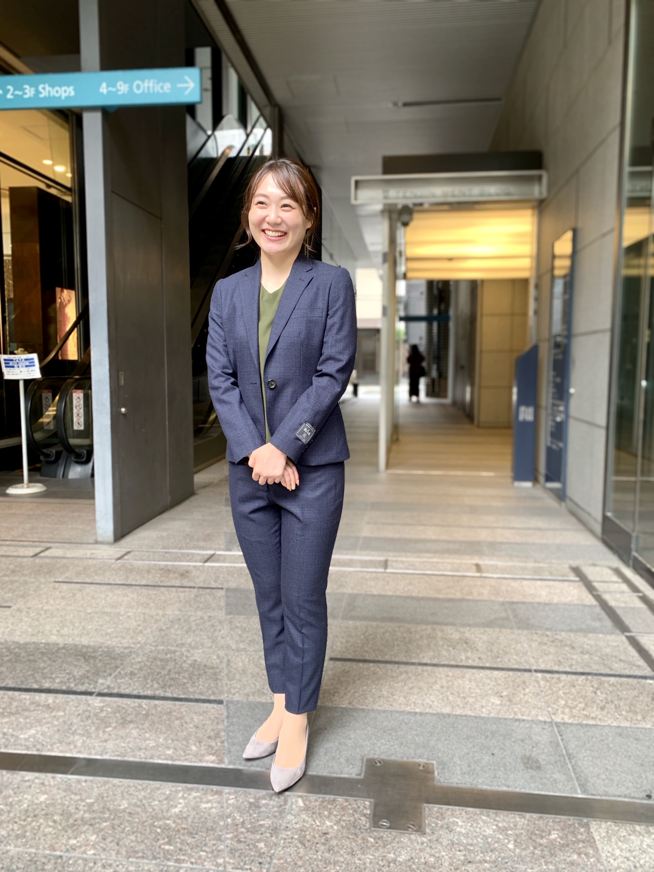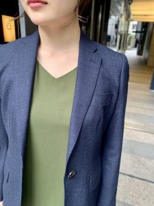 汎用性の高いネイビースーツにオリーブのカットソーは