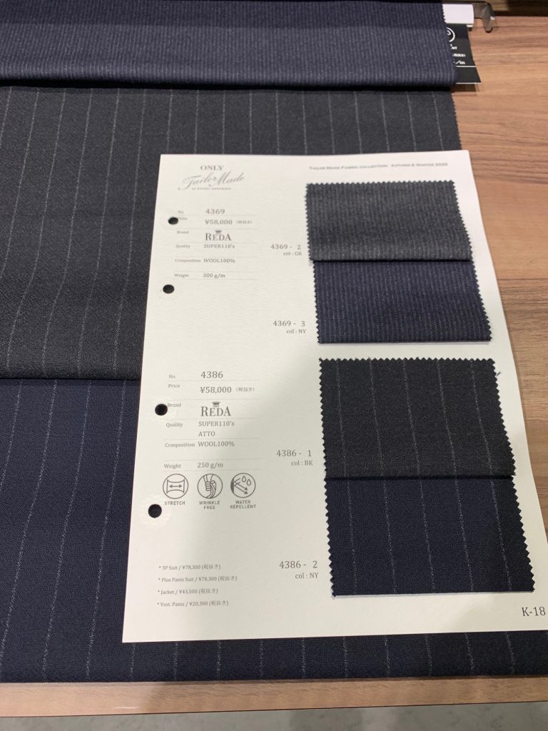 REDA ATTOは、SUPER110’sの原毛を使用し軽く滑らかな肌触りです。さらに、伸縮性・防シワ性・撥水加工を施した機能が特長の生地です。