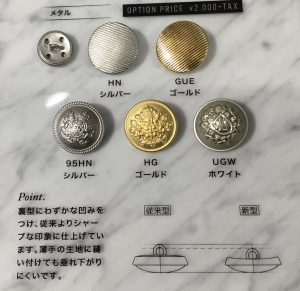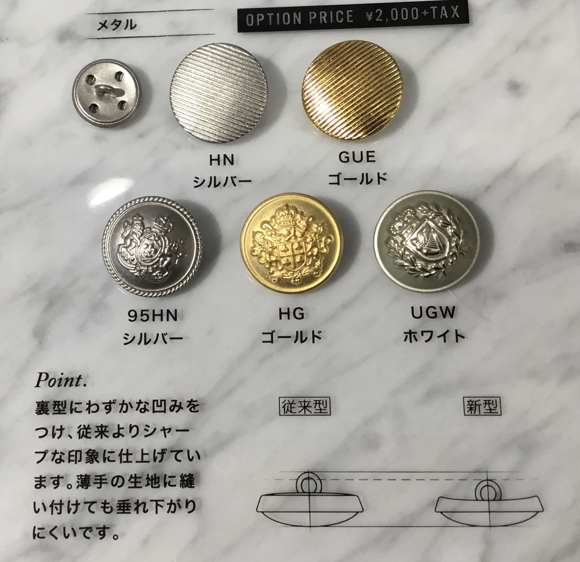 今季トレンドの紺ブレにオススメのメタルボタンでございます。