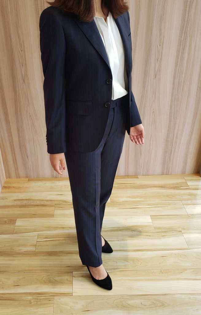 パンプスと合わせてパリッと女性らしさを演出もできますし、ローファーやレースアップシューズなどと合わせてマニッシュに演出しても素敵なスーツになってます☆