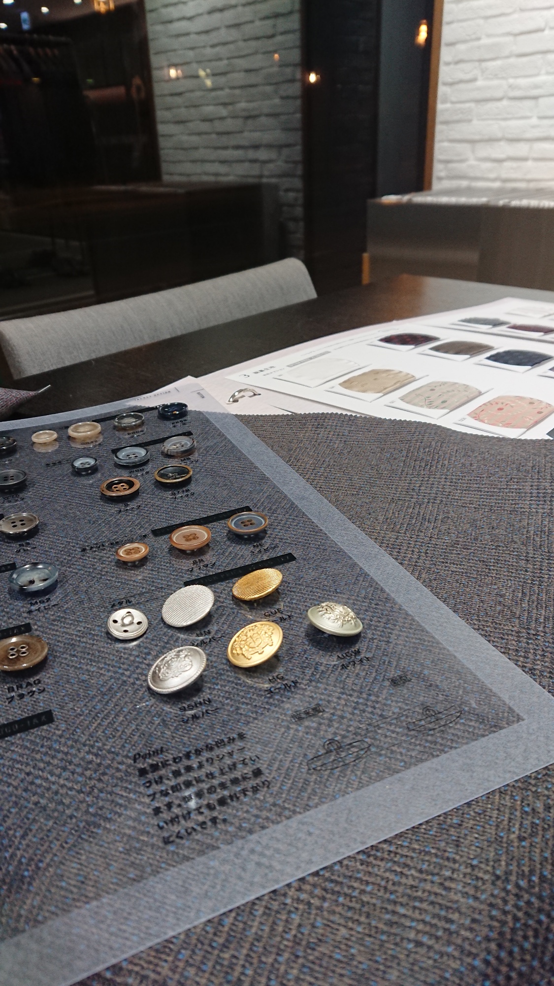 採寸が終わりましたら、次は裏地やボタンなど、細かいディテールをお決めしていきます。