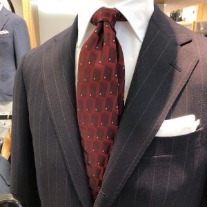 温かみのある赤ネクタイは季節感を感じさせるコーディネートでもあり、