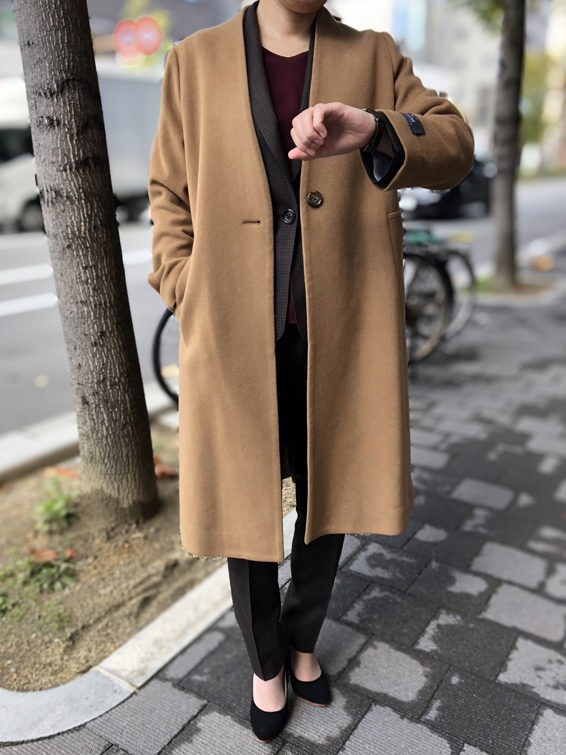 アウターにはキャメルのノーカラーコートを合わせてみました✨