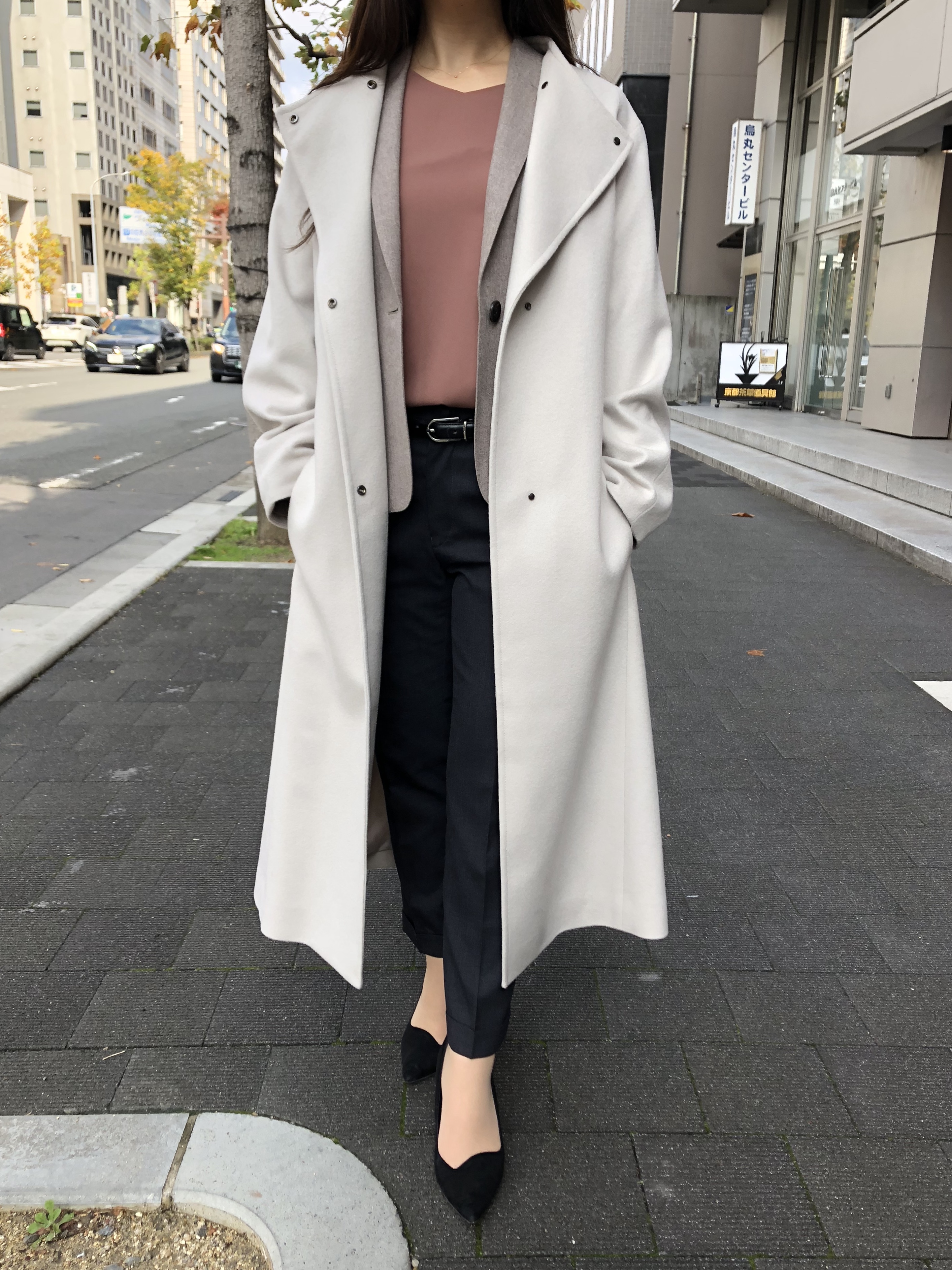 アウターに新作のロングコートを羽織ったジャケパンコーデにしてみました^^