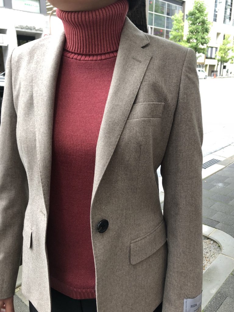 さて、薄いベージュスーツの着回しはインナーに濃いベージュを。