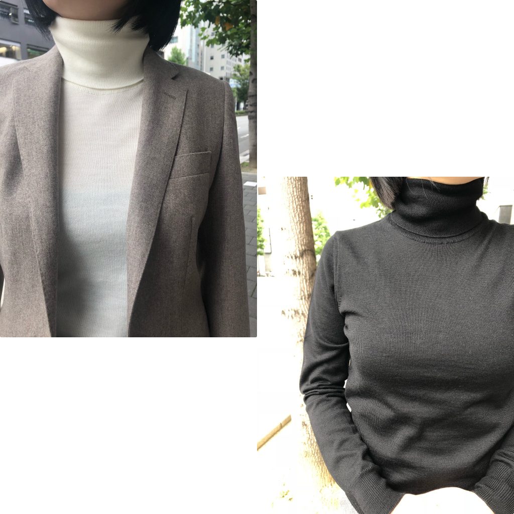 こちらは上品でシンプルなタートルニット。