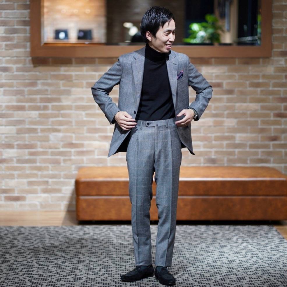 イタリアンテイストで現代的なシルエットと、イタリア生地らしい配色のグレンチェックと相まって