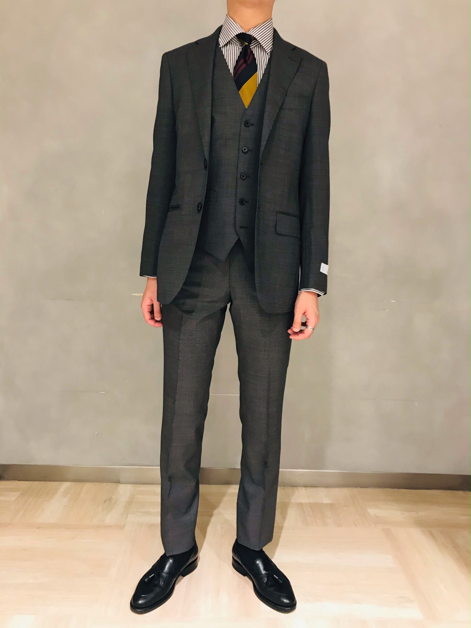 同じくネイビーや濃いブラウンの無地スーツとも相性◎です!