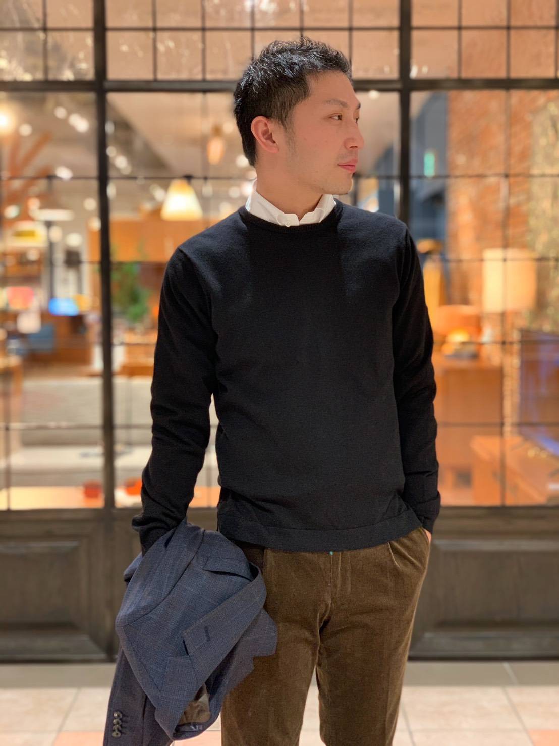 ハイゲージと言われる薄手のニットは冬のスーツスタイルをドレスダウンするには最適です☆