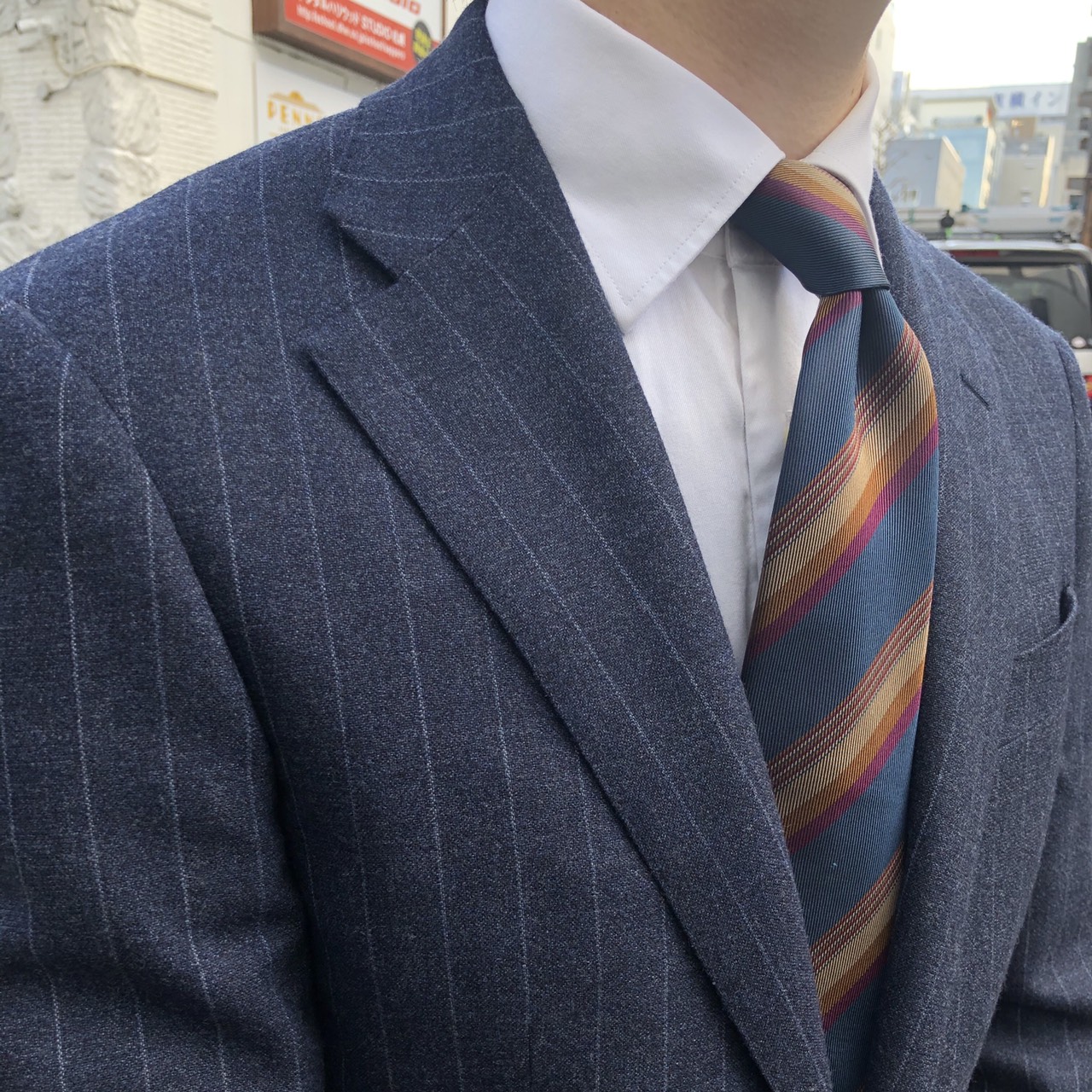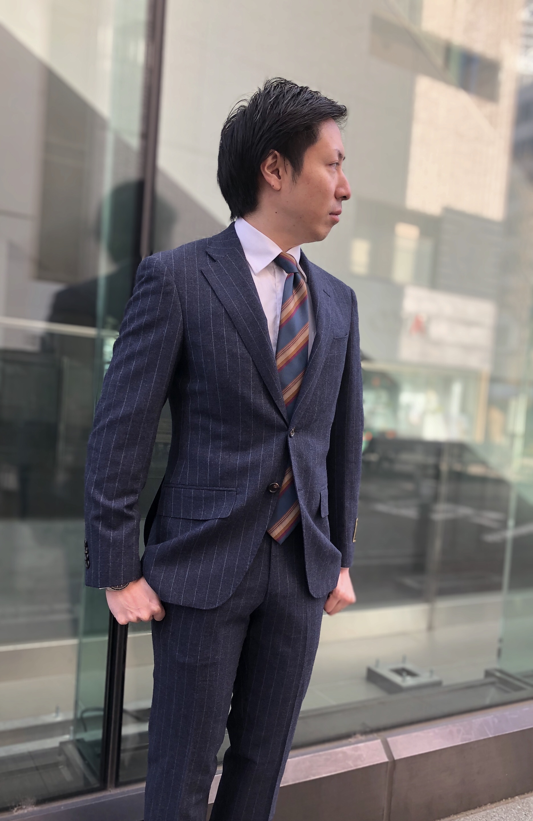 Vゾーンはシンプルにブルーのレジメンタルタイで合わせました。