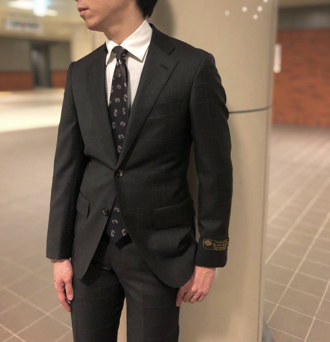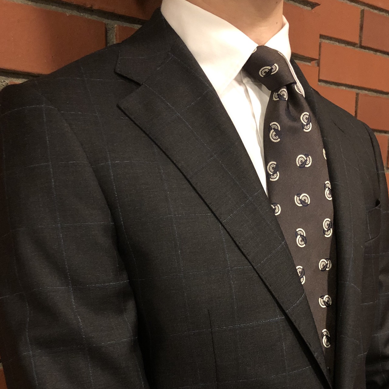 続いてはCANONICO社から、グレーのブロックチェック柄スーツ。