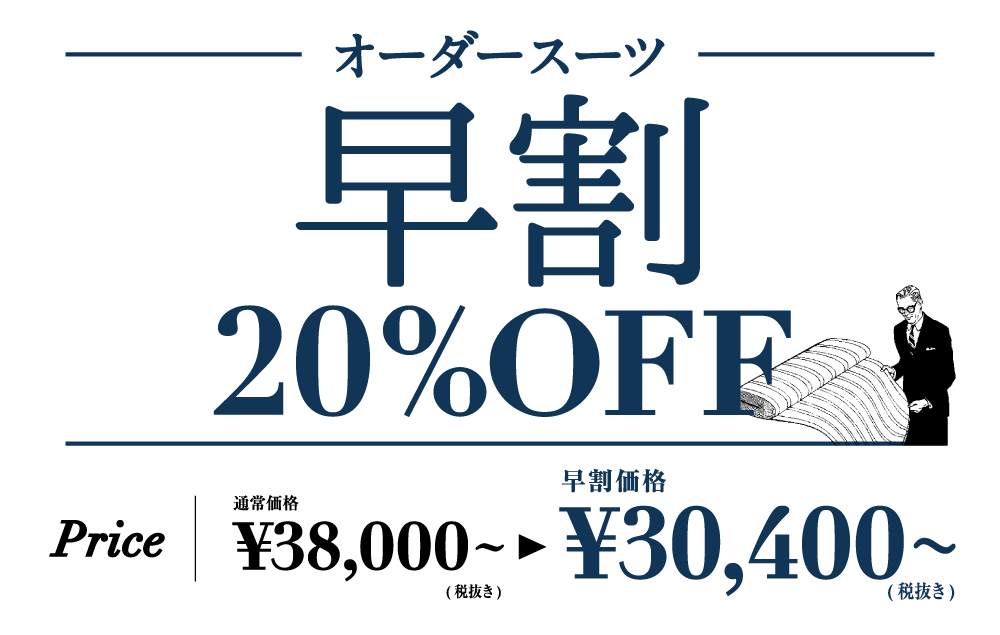 自社のオーダースーツブランド「テーラーメイド」において、春夏生地・オールシーズン生地が納期約2ヶ月で通常価格の20%OFF(限定2000着)になるオーダースーツキャンペーンのことです。