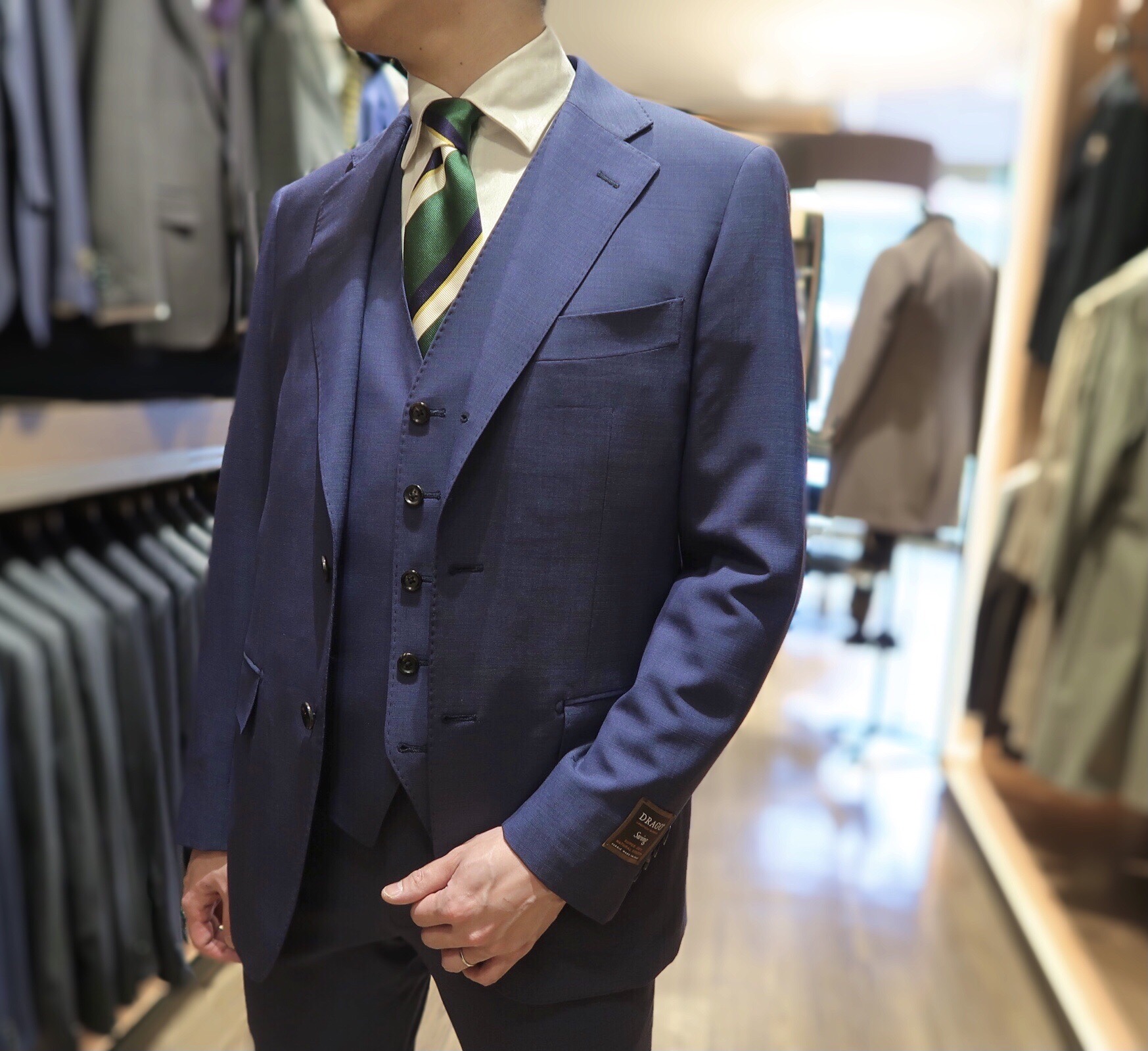 まさに暖かくなっていく時期にふさわしい爽やかな清潔感あふれる3ピーススーツは