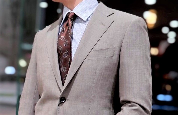 こちらのスーツは春らしく爽やかなサックスブルーシャツと、ブラウンタイでコーディネートしました。