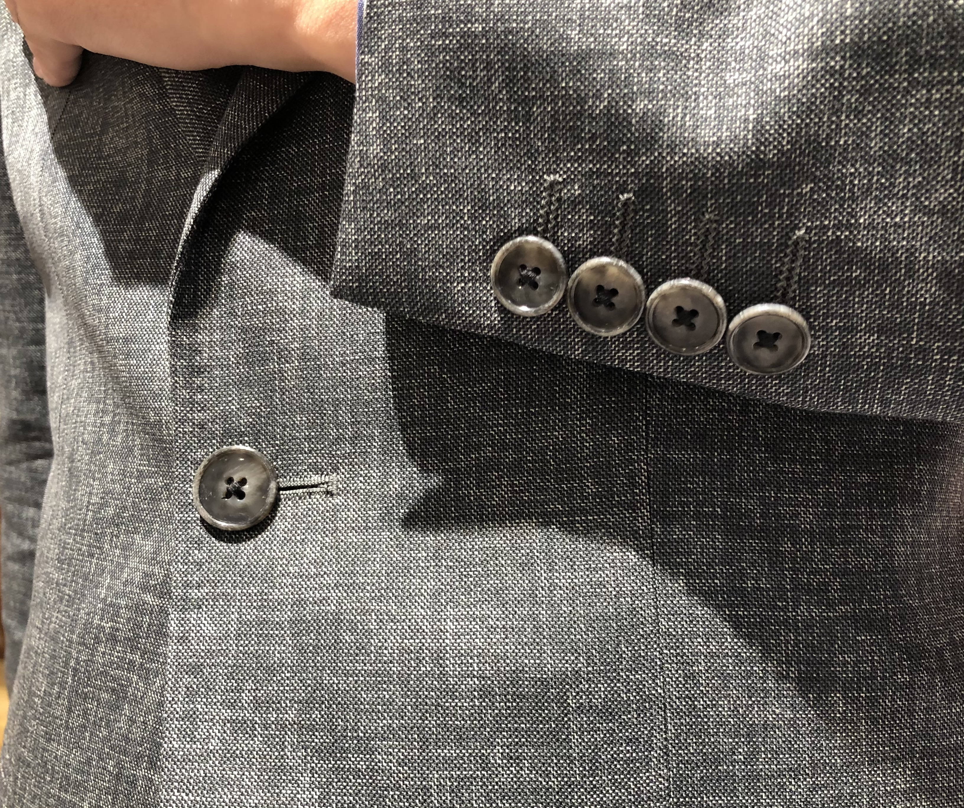 既製品ですと濃いブラウンか、ブラックのボタンになることが多いですがここはオーダーならではのチョイスで!!