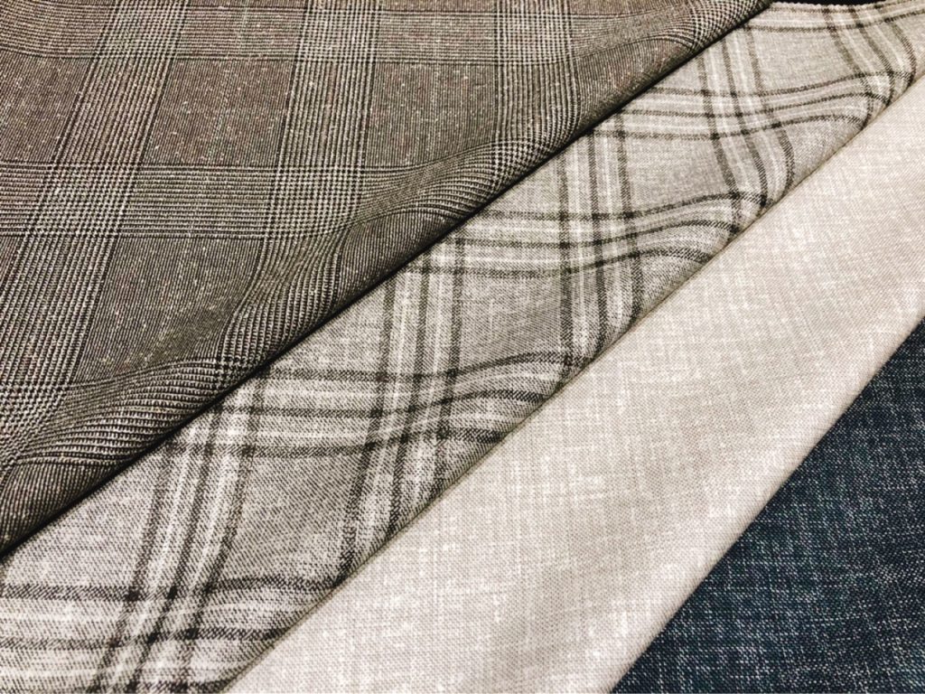 写真中央左の生地は、伝統的なタータンチェック柄を現代的に表現しています。