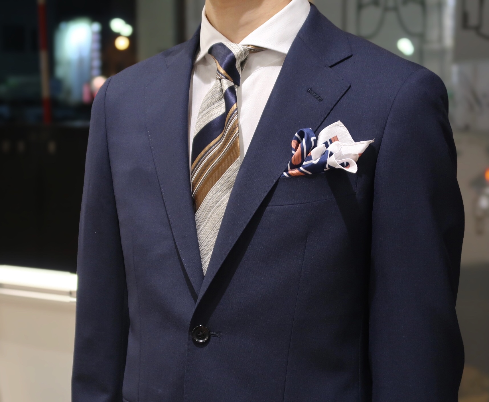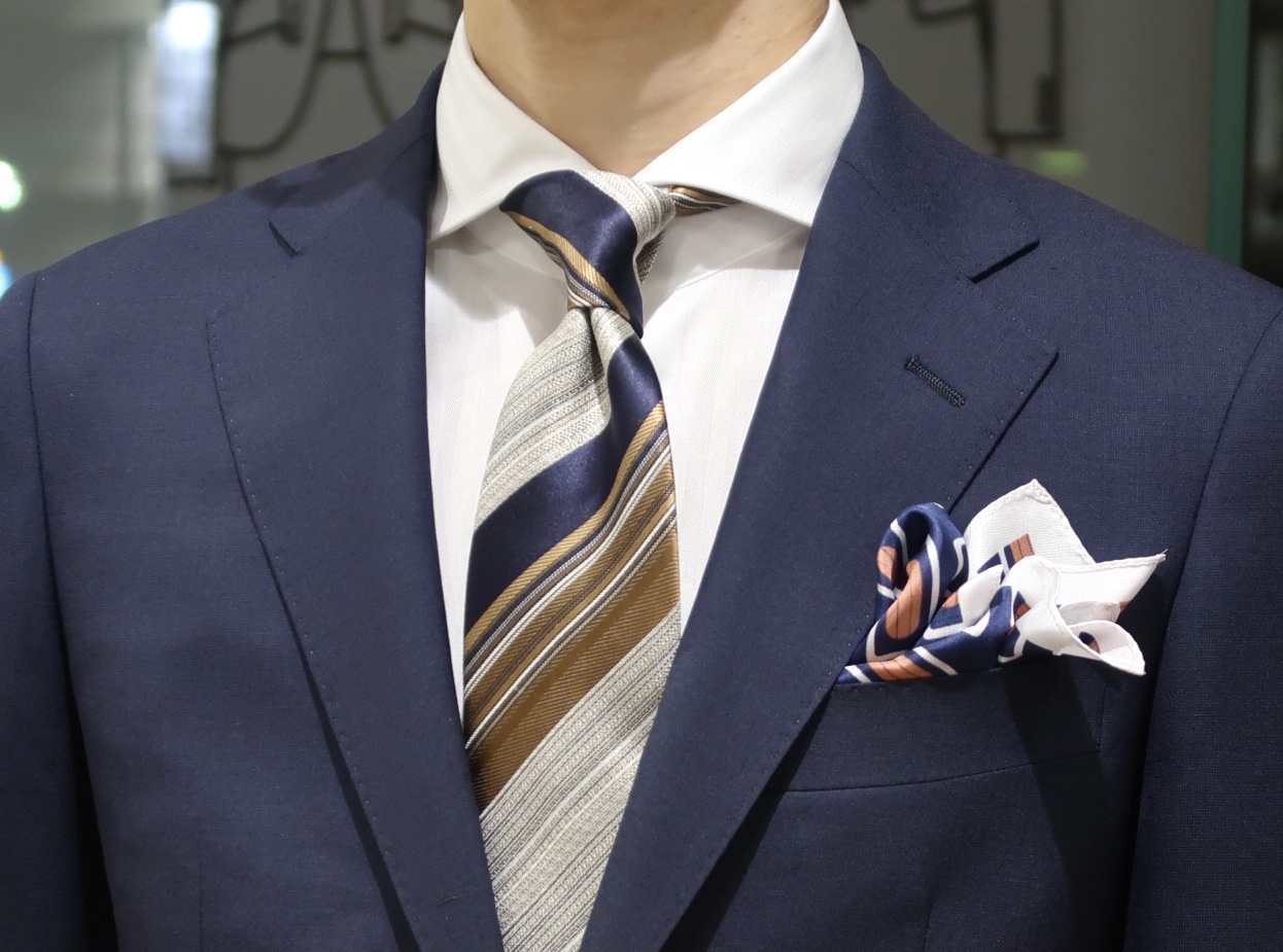 今回は濃紺のスーツにブラウン・ネイビー・グレーのストライプを配したネクタイと同系色のチーフを入れ、