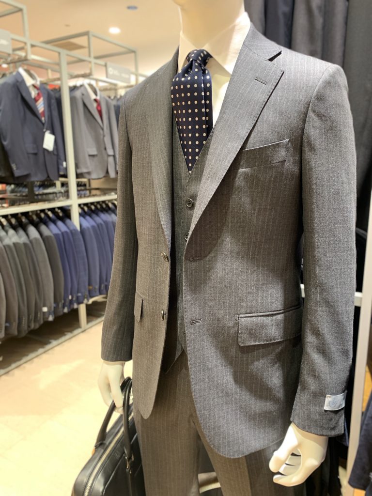 グレーは柔らかな落ち着いた印象を与えてくれます。さらにビジネススーツの憧れストライプスーツは「できるビジネスマン」を演出できます。