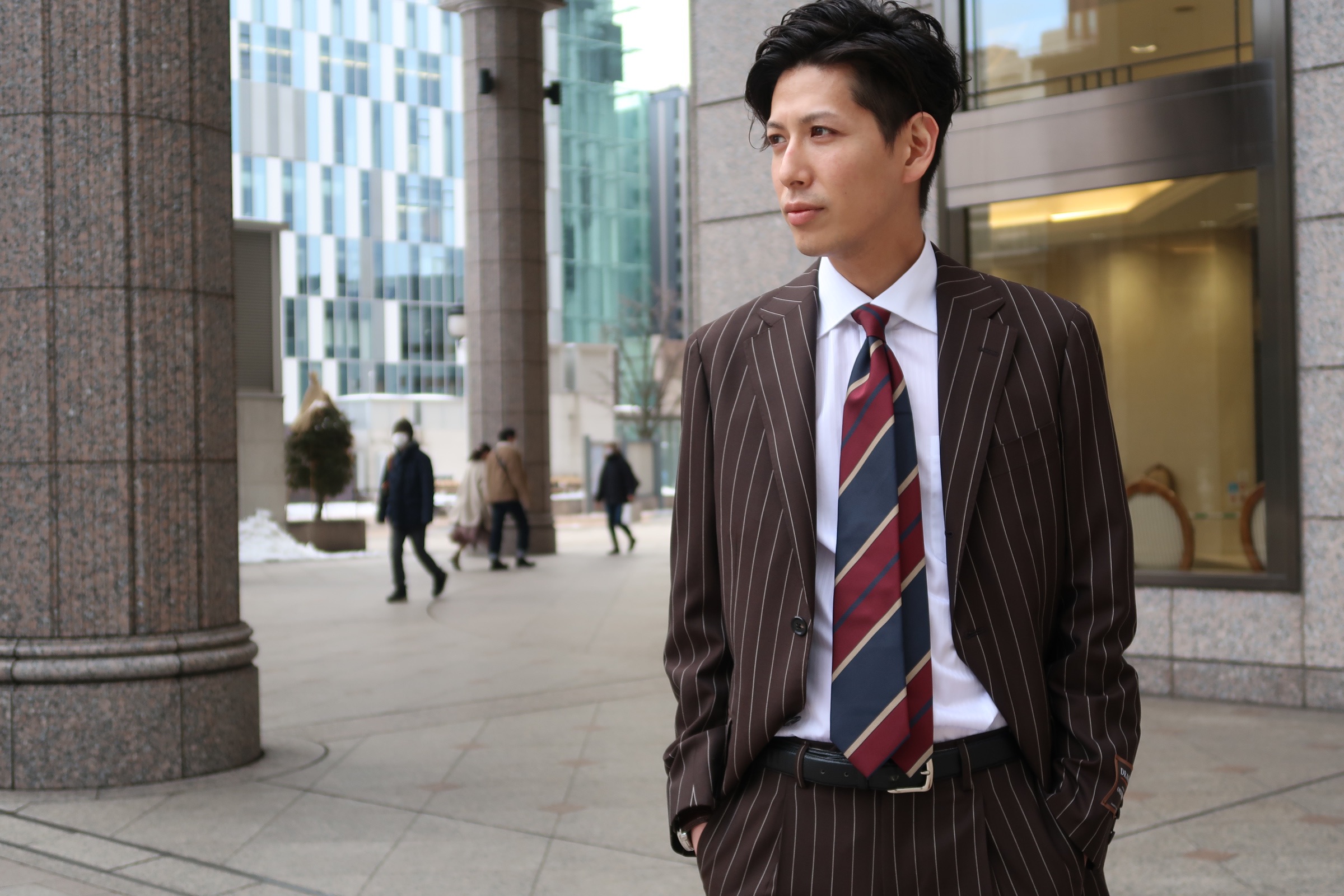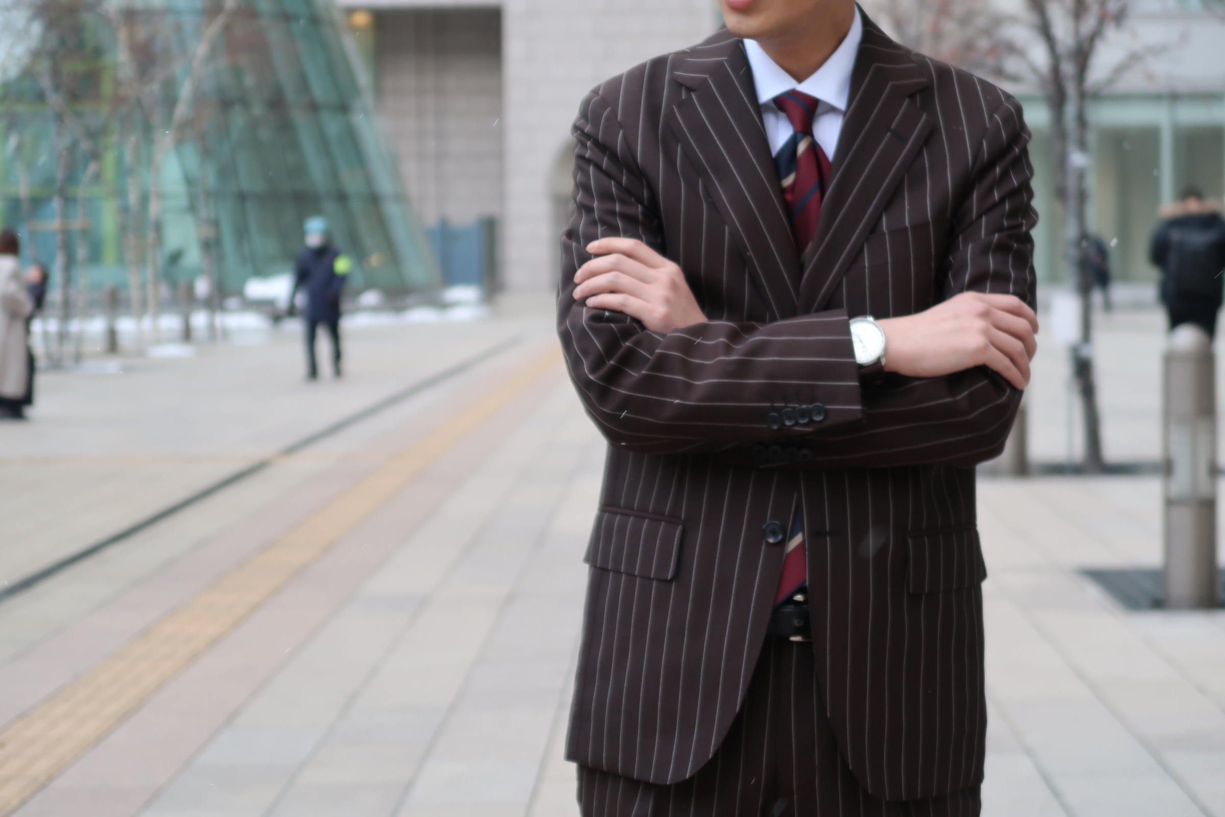 広幅のチョークストライプが特徴的のブラウンスーツ✨