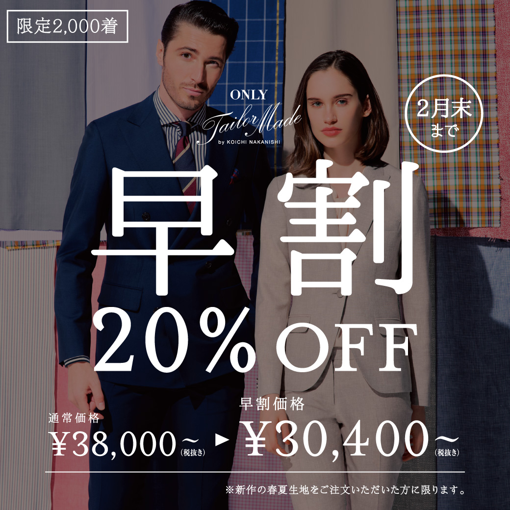 オーダースーツの早期受注で20%の割引ができるキャンペーンです!(納期:約2ヶ月)