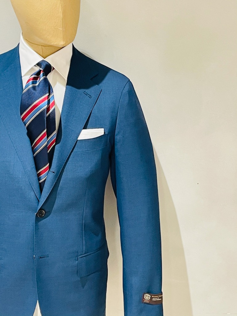 今年トレンドの鮮やかなブルーのスーツに、